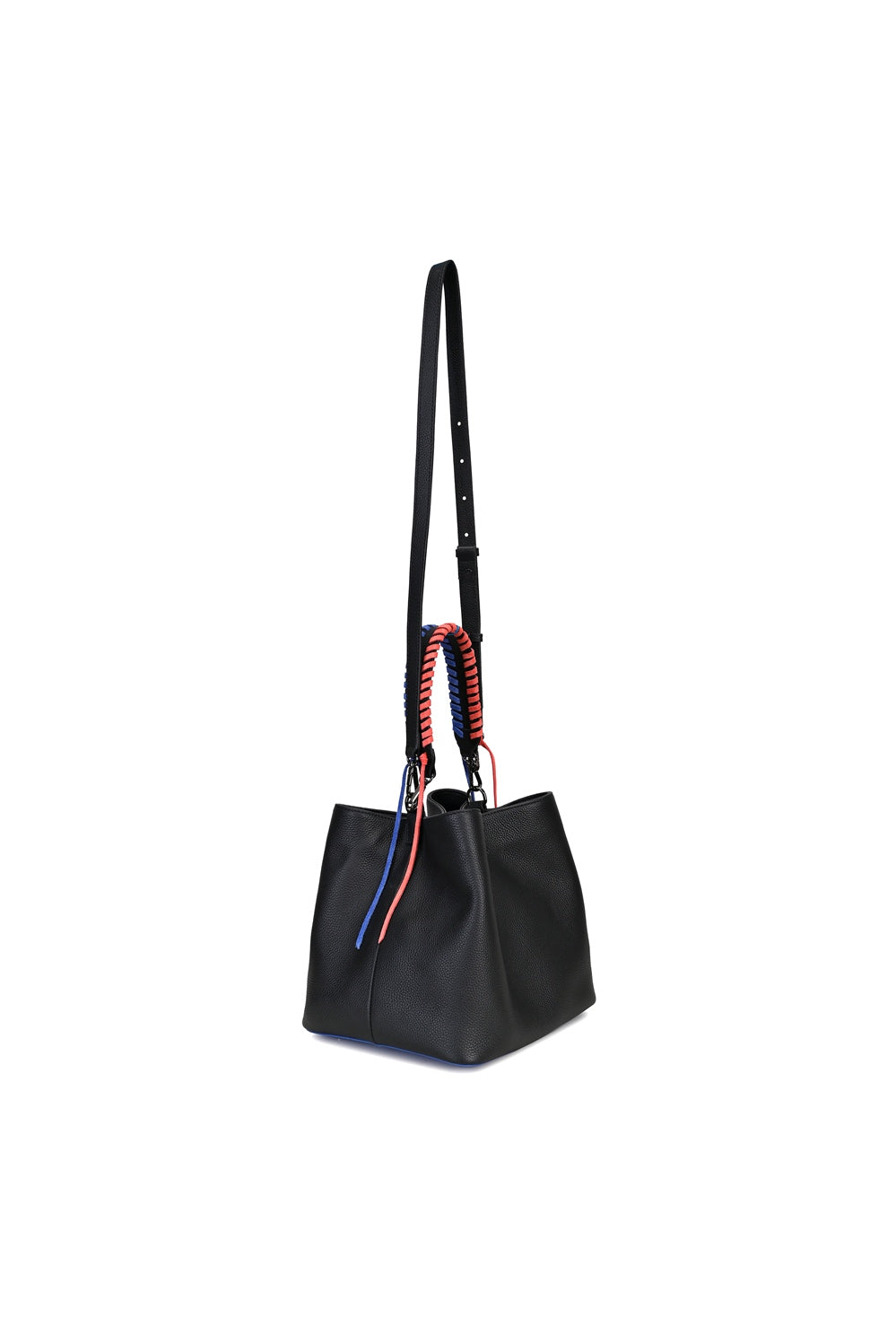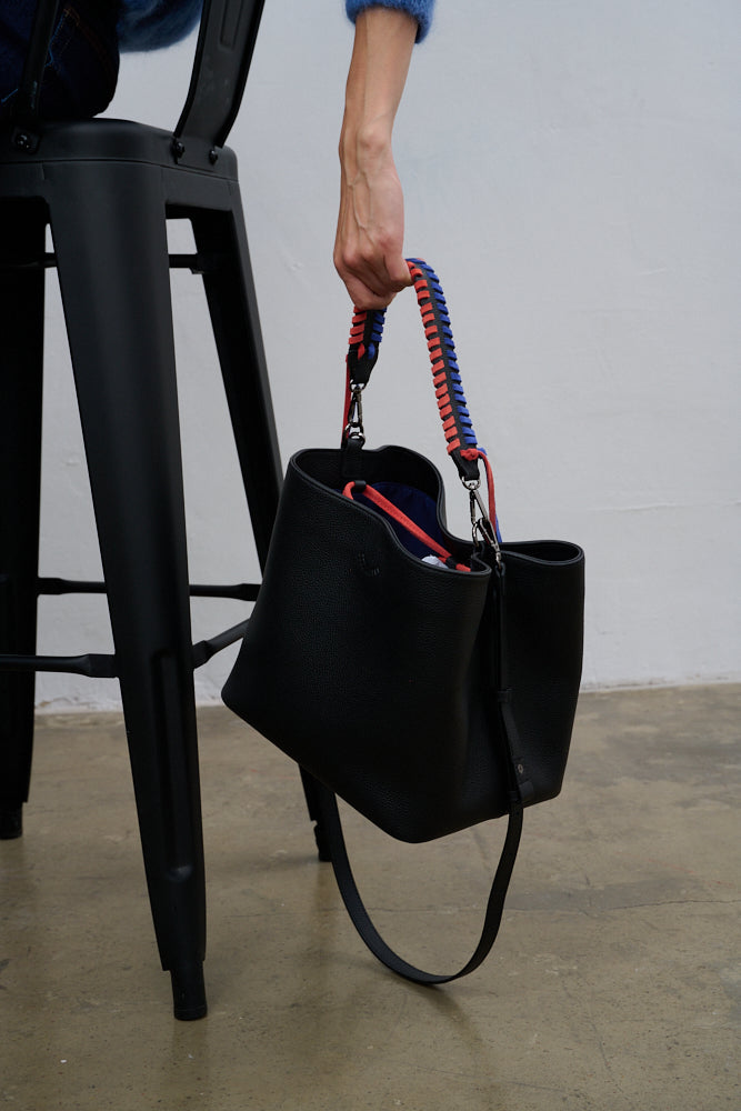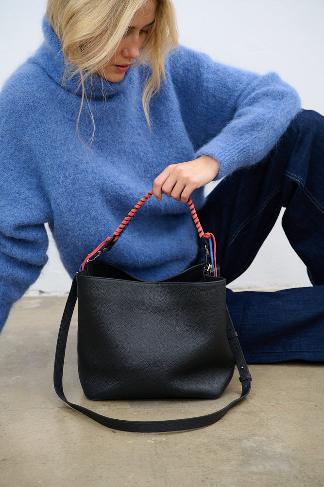 Electric Night bag is perfect proof that black doesn't have to be boring. This bag-style model delights with its details: the short handle is adorned with an artistic weave of blue and orange straps.