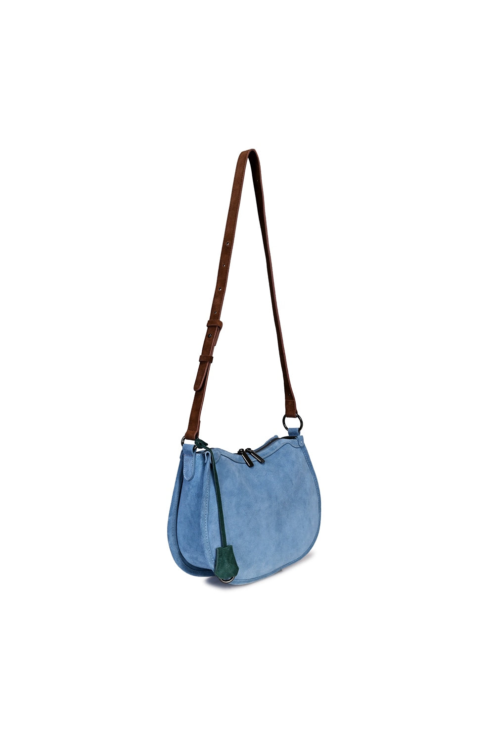 Riviera handbag is a combination of freshness and elegance. This fashionable crescent-shaped model captivates with its base color in a shade of blue. It is paired with classic brown suede accents and deep green details.