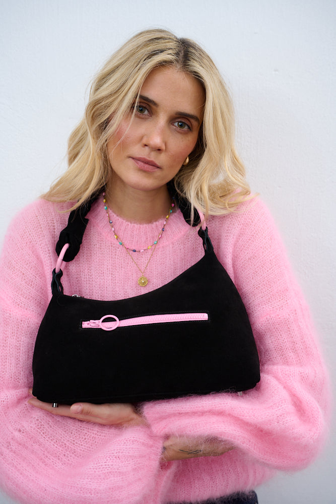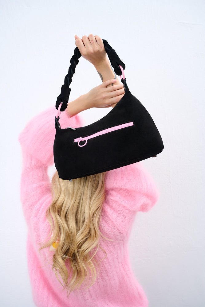 Rebel Pink suede bag is the perfect choice for the woman who likes to break the mold. This timeless, black, half-moon bag is crafted from high-quality suede. Its classic character is enhanced by powder pink details.