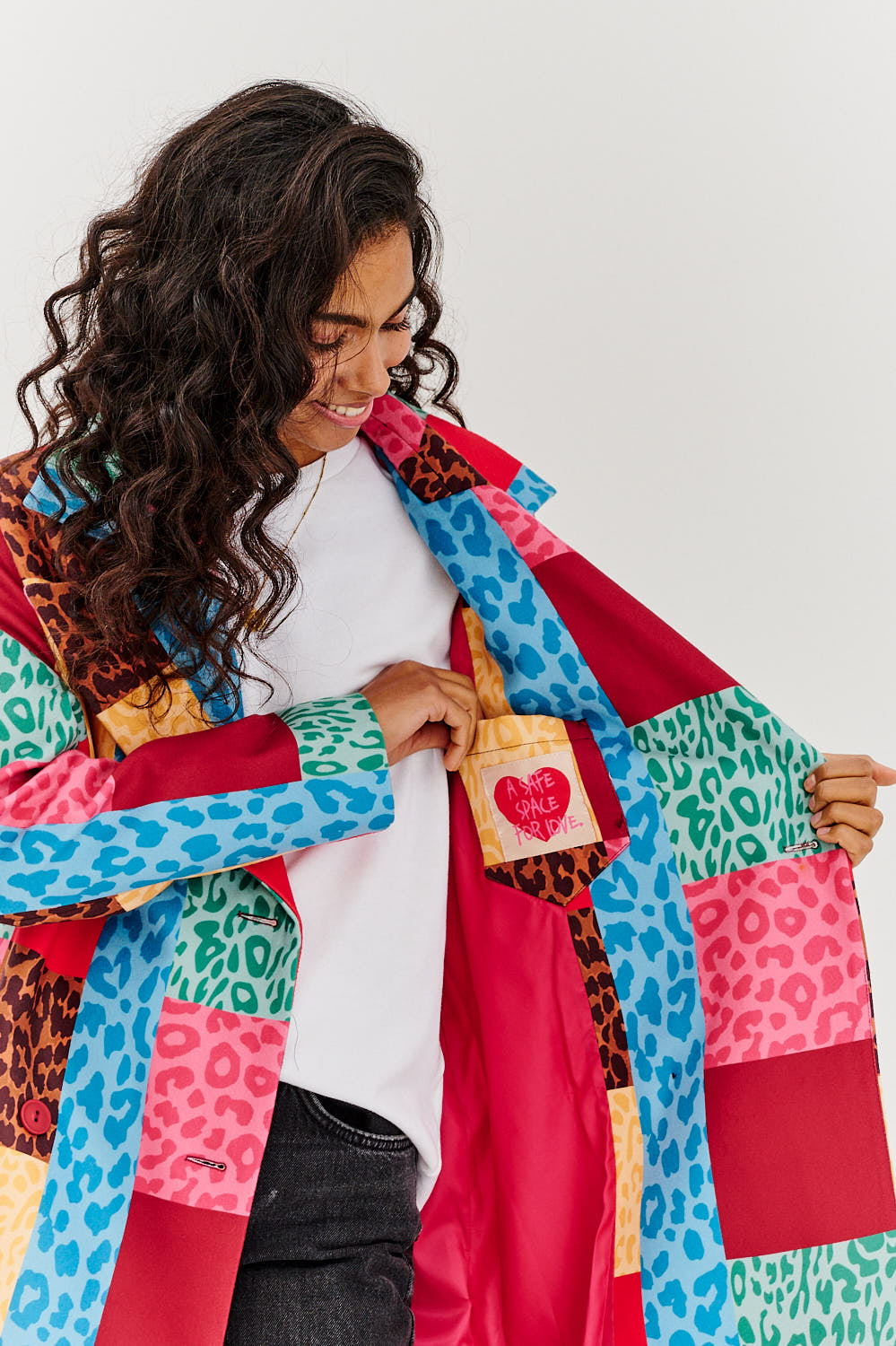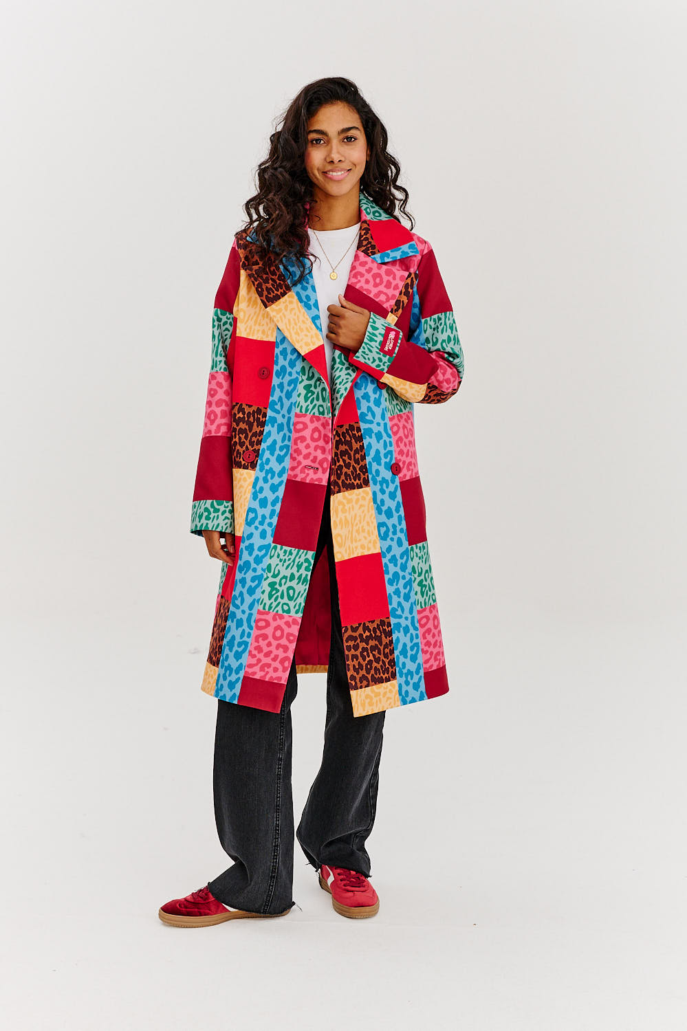 Urban Roar double-breasted patchwork coat is a combination of urban nonchalance and nature's energy. Its patchwork design impresses with a bold combination of colors and patterns - from leopard print to contrasting blocks in shades of red, green, blue and gold. The double-breasted cut emphasizes classic elegance, while adding character to any outfit.