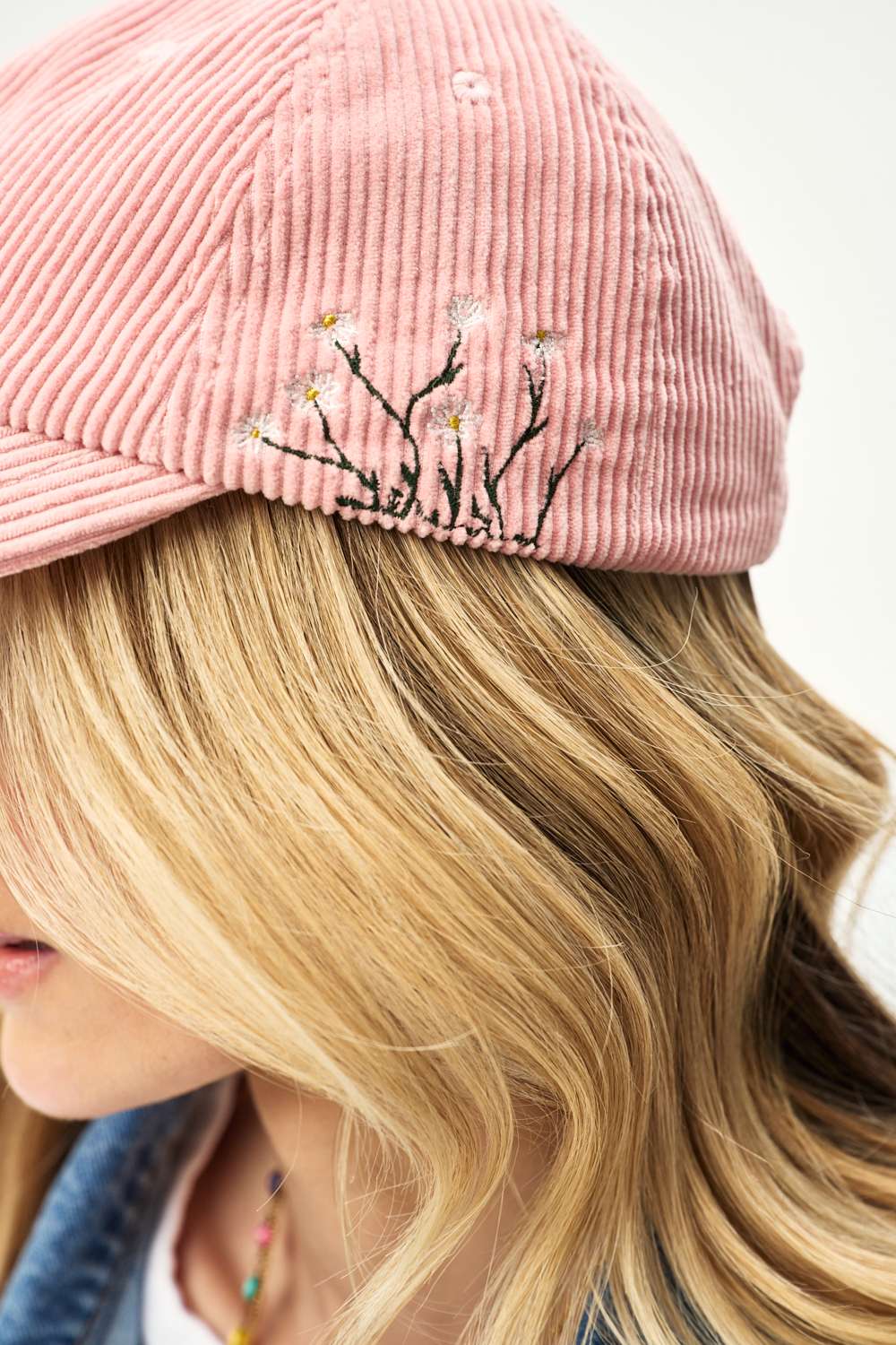 The Wild Daisies baseball cap combines girly pink with the ruggedness of corduroy. Embroidered daisies "growing" from the visor are a detail that delights at first glance.