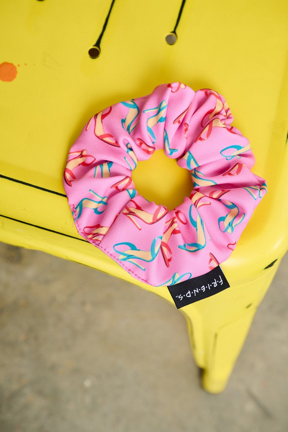 The yellow scrunchie is covered with drawings of a turkey, lobster, and a frame. The pink one features colorful pins. The black one features neon outlines of iconic locations and objects from the show. Wear them in your hair or on your wrist as a fashionable bracelet.