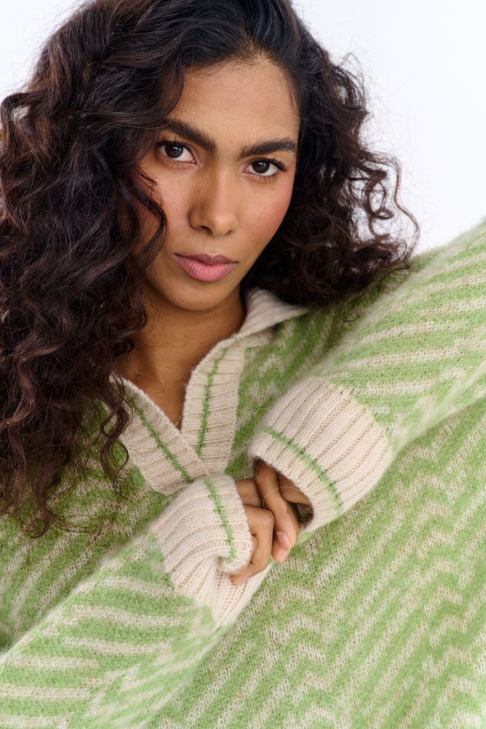 El jersey polo de mohair Almost Silence es la quintaesencia del estilo preppy. Inspirado en el estilo académico, combina la elegancia deportiva con un toque de nostalgia. El verde sereno en un sutil patrón de espiga crea un hermoso fondo para el cuello y los puños blancos.