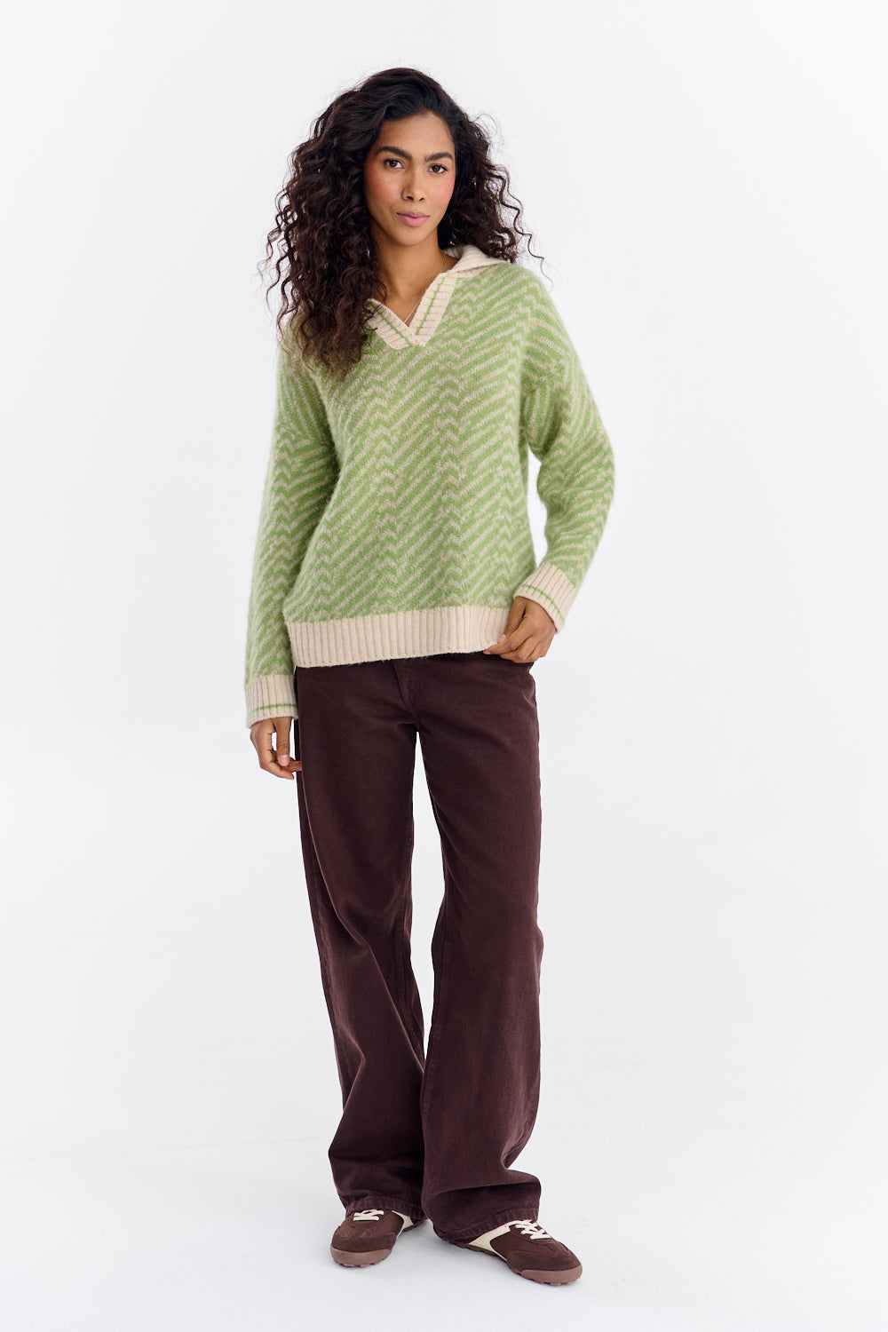 Un corte más holgado con mangas ligeramente abullonadas asegura comodidad y libertad de movimiento. El escote en V profundo resalta hermosamente el cuello y complementa los collares. Llévalo con tus vaqueros favoritos, pantalones de lana o una falda plisada para un look de "lujo silencioso".