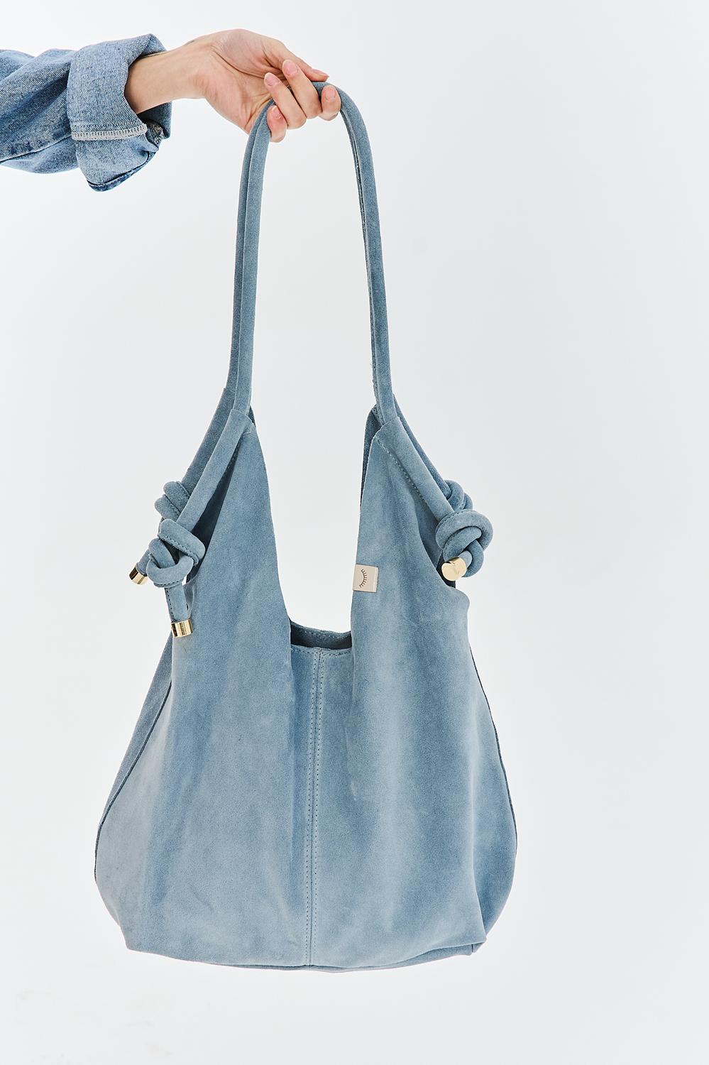 El bolso de cuero Aveline encanta por su forma y color. Confeccionado con ante de la más alta calidad, se caracteriza por su suavidad y durabilidad. Los nudos decorativos en las asas le dan un toque moderno y artesanal, mientras que el cierre magnético garantiza la seguridad de su contenido.