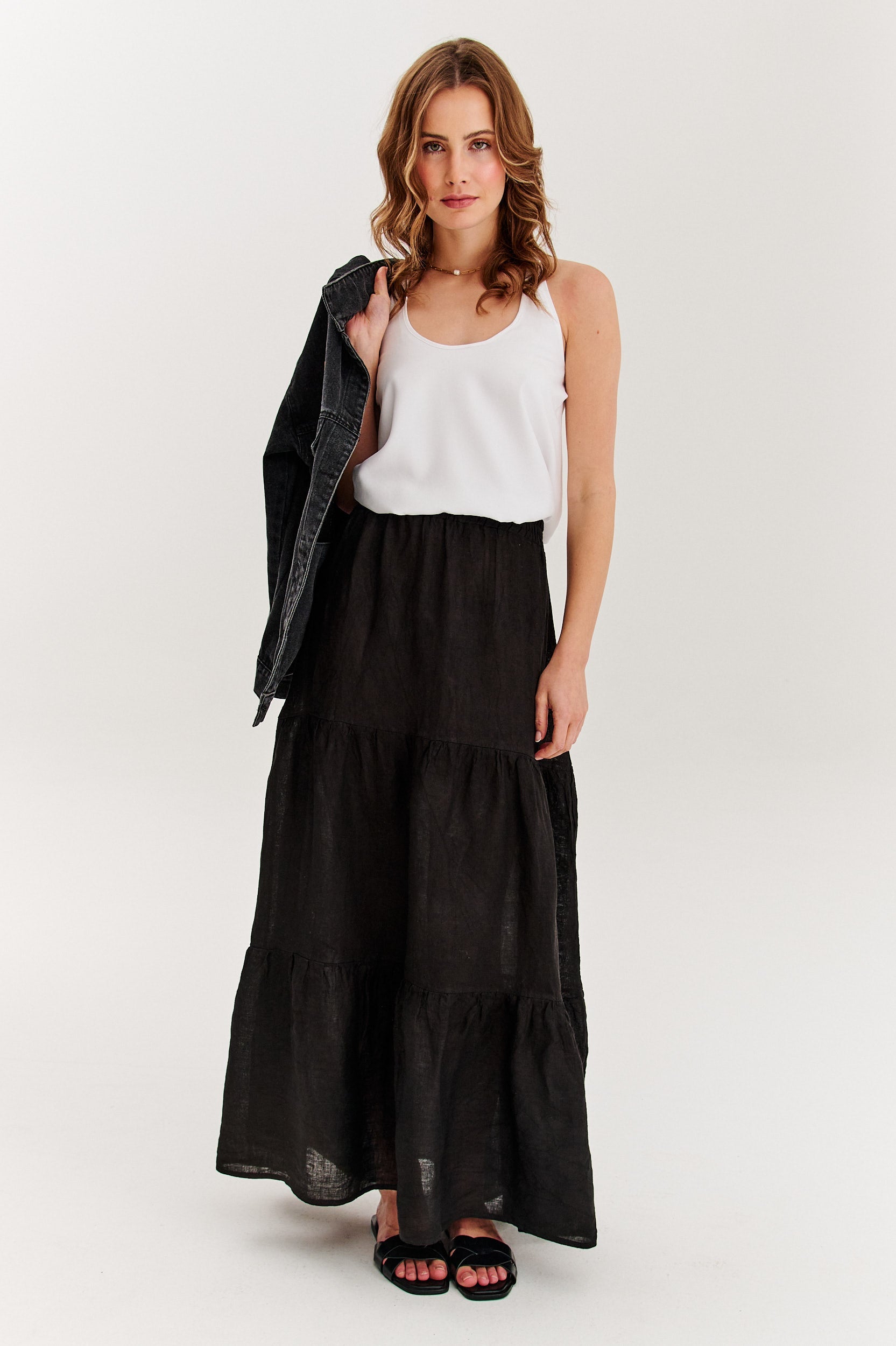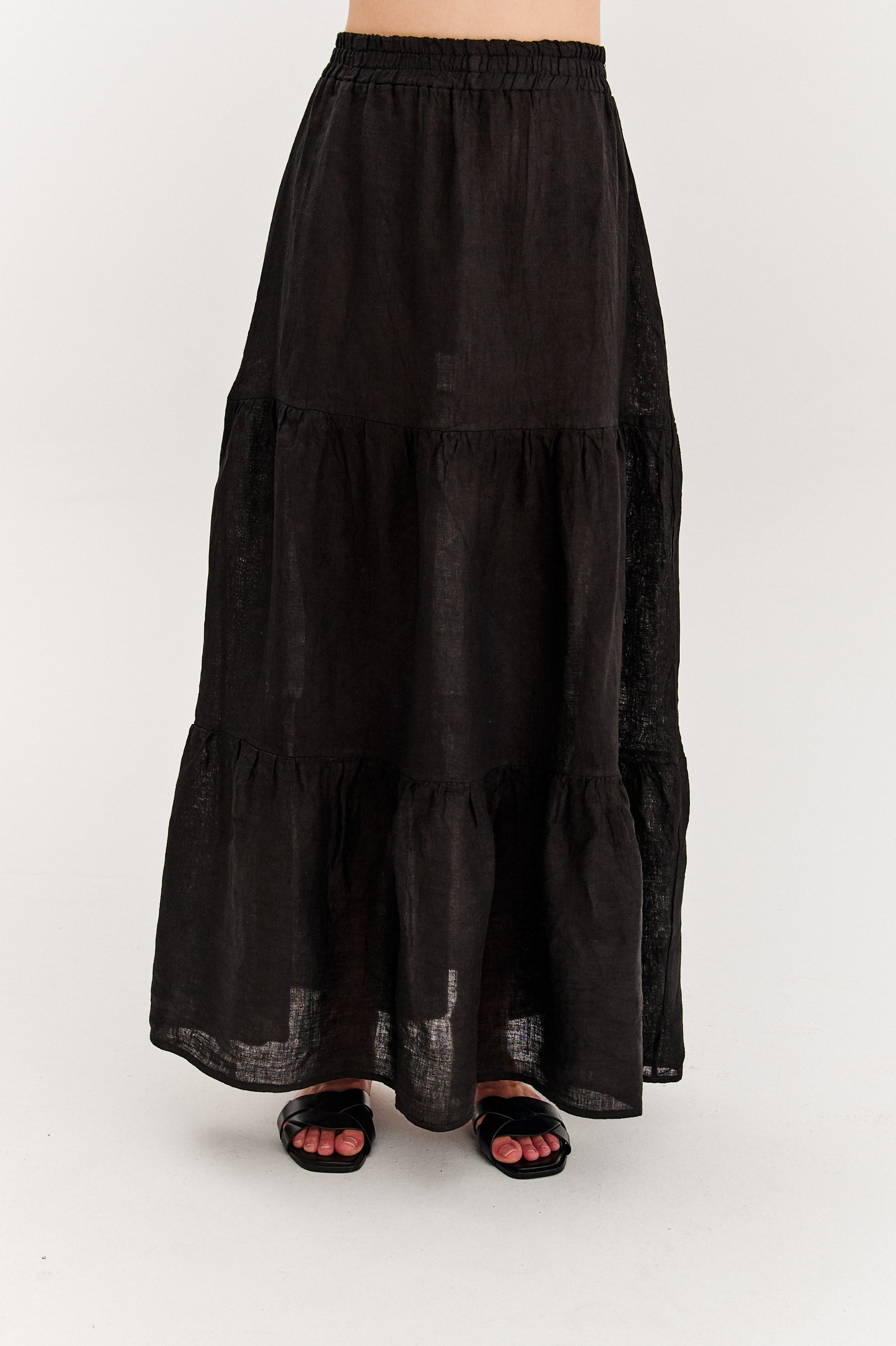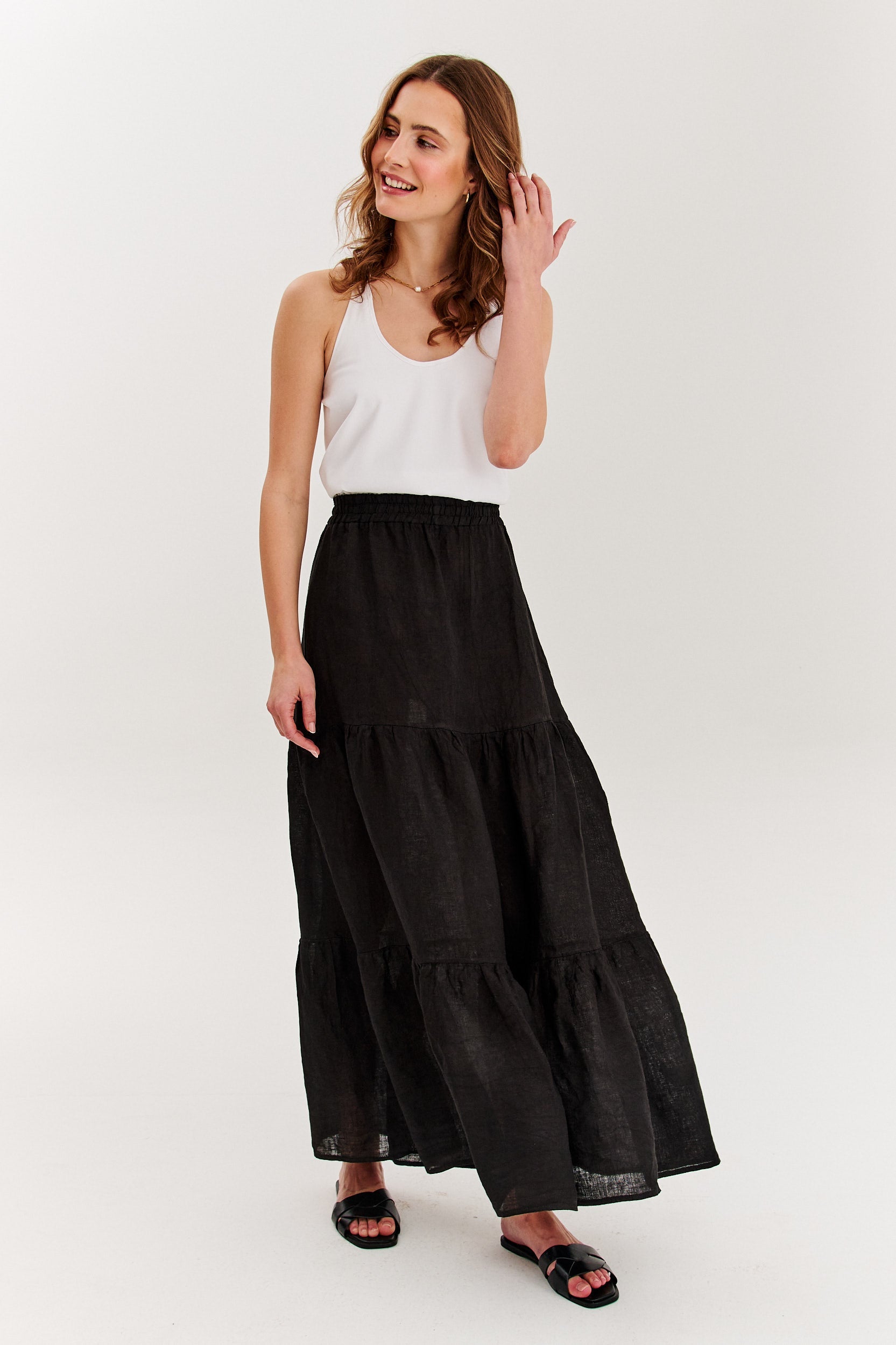 La falda larga de lino Black Lotus es una prenda atemporal que combina el estilo clásico con la facilidad boho. Hecha de 100% lino, encanta con la textura natural de la tela y un diseño cómodo que presenta una cinturilla ancha y delicados frunces a lo largo de su longitud. Su color negro la hace extremadamente versátil y perfecta para innumerables looks.