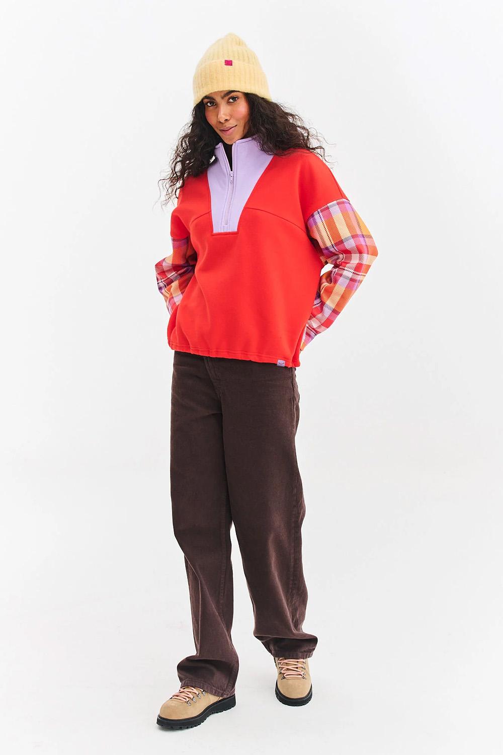 El sweatshirt After Reading es un modelo único que combina diferentes tendencias. Un corte deportivo con cuello alto y cremallera se yuxtapone aquí con mangas estilo patchwork, en las que se mezclan diferentes patrones de cuadros en tonos amarillos y morados. El color principal óxido del sweatshirt lo une todo de manera hermosa.