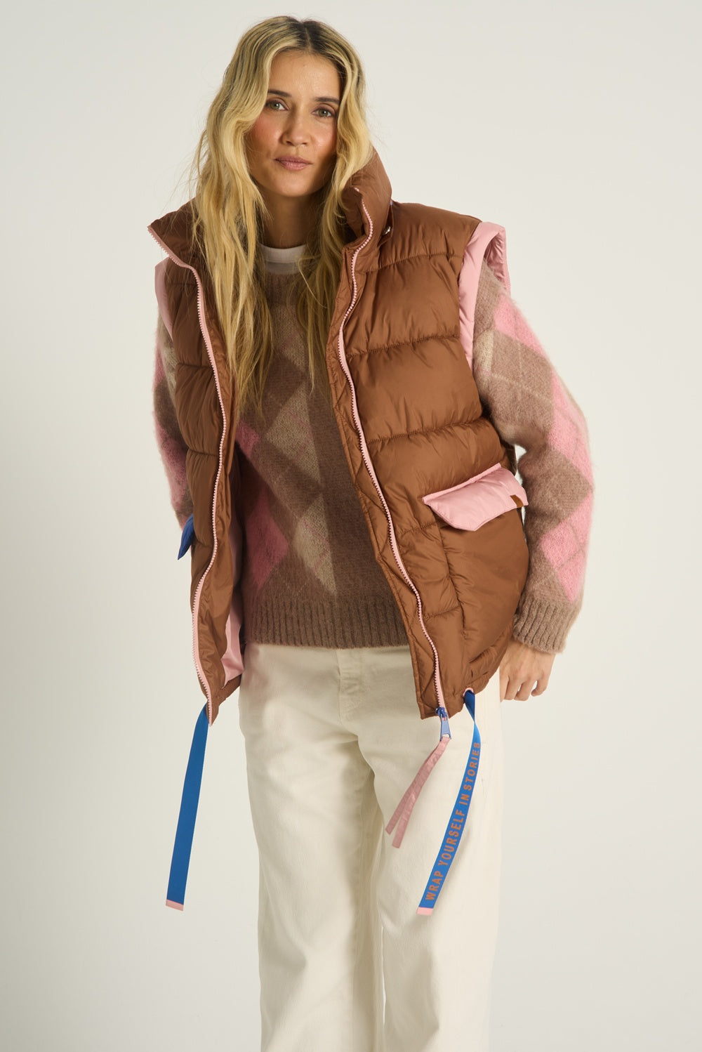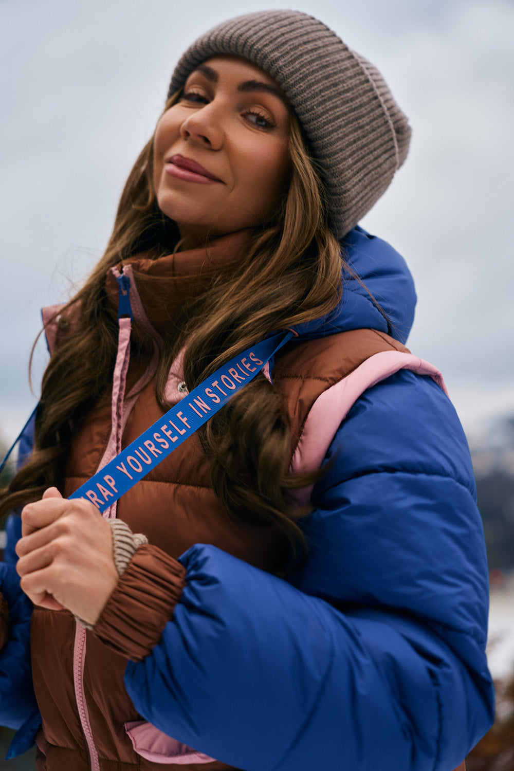 Chaqueta de invierno Alpenglow con mangas desmontables es la compañera perfecta para aventuras invernales en la montaña y en la ciudad. Este modelo destaca por su combinación de colores a la moda: un cuerpo marrón cálido se combina con mangas azul intenso y un forro de capucha y cremallera en rosa pastel.