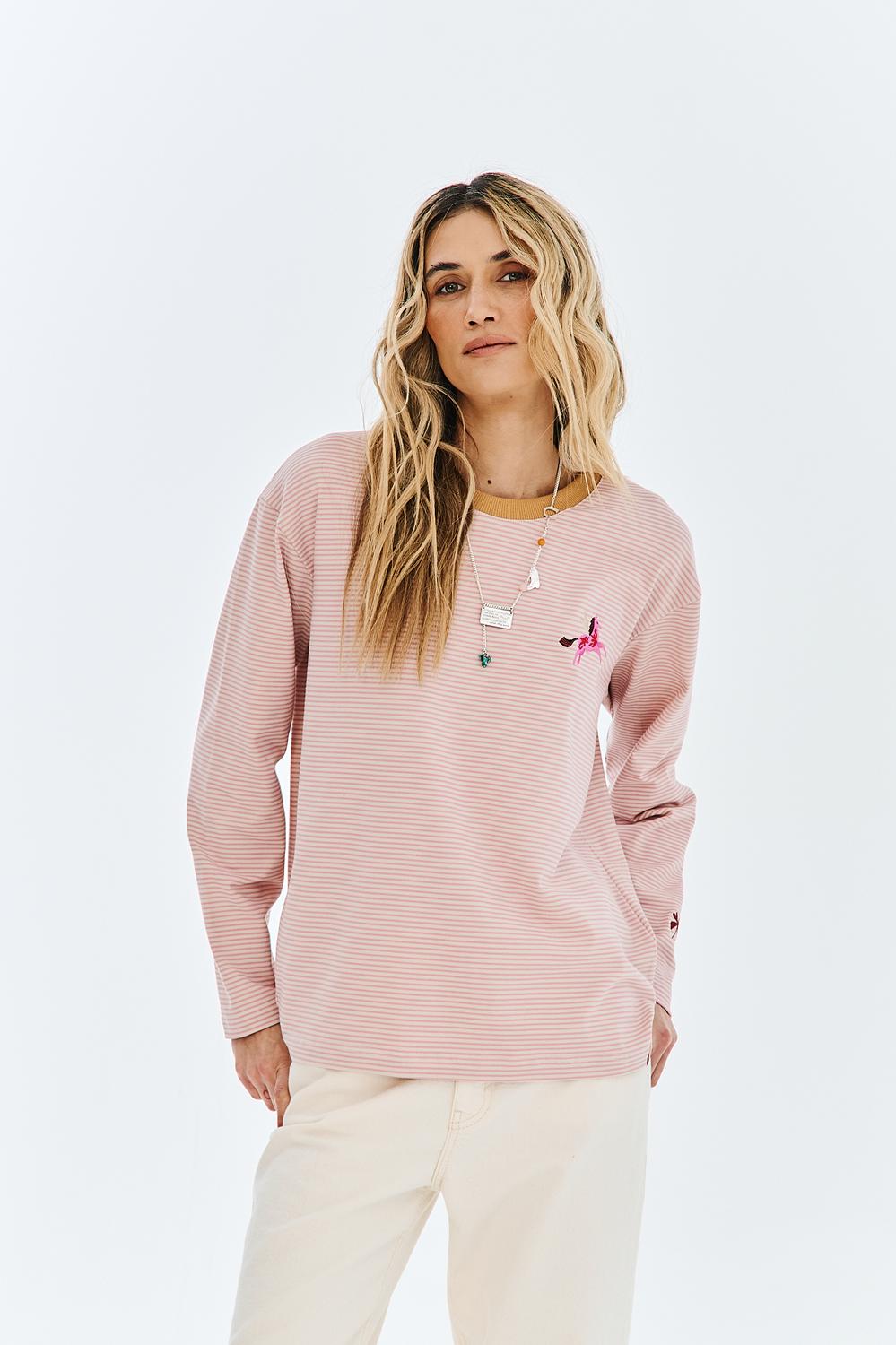 The Rose Rider Longsleeve focuses on detail. The classic pattern with narrow pink stripes is enhanced with charming embroidery depicting a horse in flight on the chest and a subtle star on the sleeve. This design combines simplicity with NAOKO's unique design.