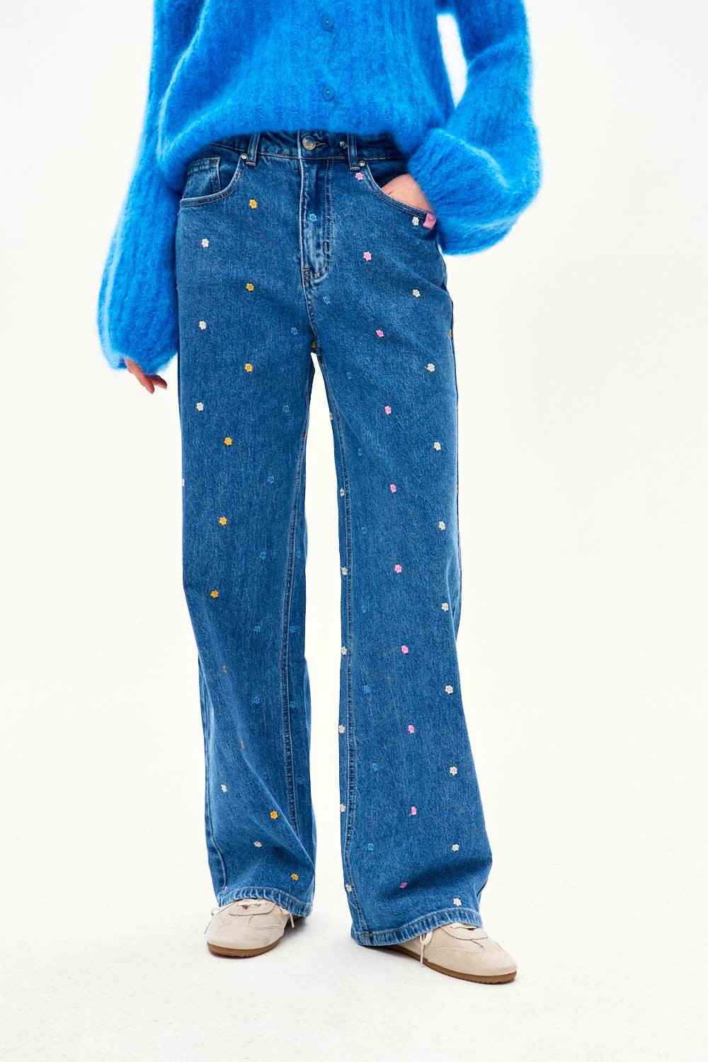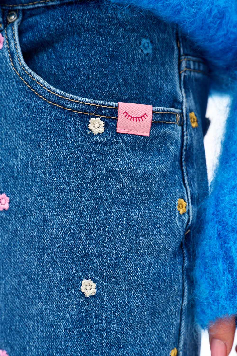 Los jeans Malibu Spring destacan porsu pequeño y colorido bordado por todas partes. El tono más oscuro del denim proporciona el fondo perfecto para las margaritas en tonos pastel, creando un look lleno de encanto femenino.