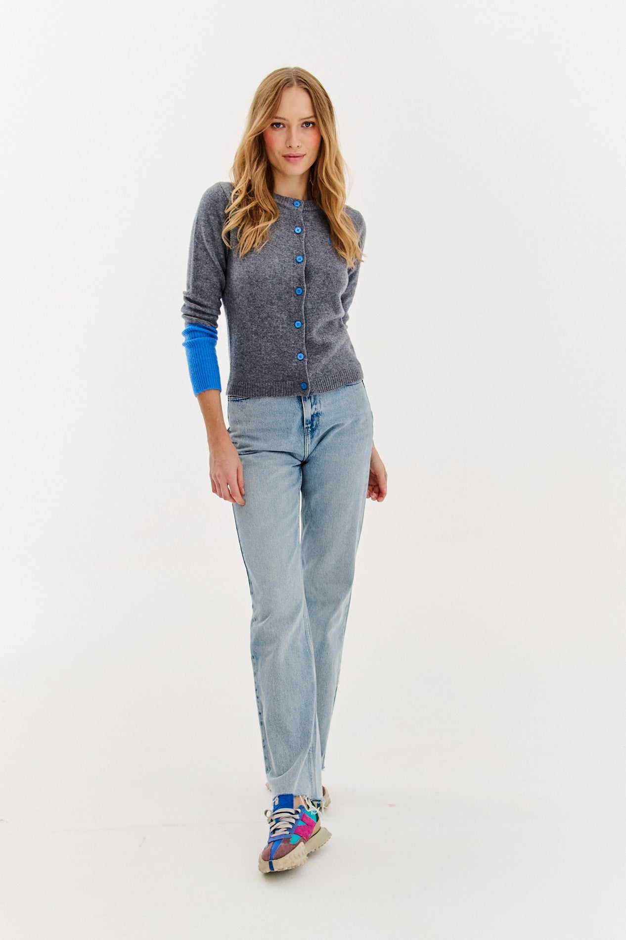 Cárdigan de lana Misty Morning es una elección perfecta para las mañanas frías y misteriosas. Su hilo gris jaspeado te envuelve como una suave niebla, creando una base clásica para cualquier conjunto, mientras que los detalles en azul contrastante —mangas, botones y corazón— añaden un toque de frescura sutil. Es un corte atemporal con un giro moderno y delicado, haciendo que el cárdigan Misty Morning sea tanto versátil como único — un verdadero imprescindible para cualquier guardarropa.