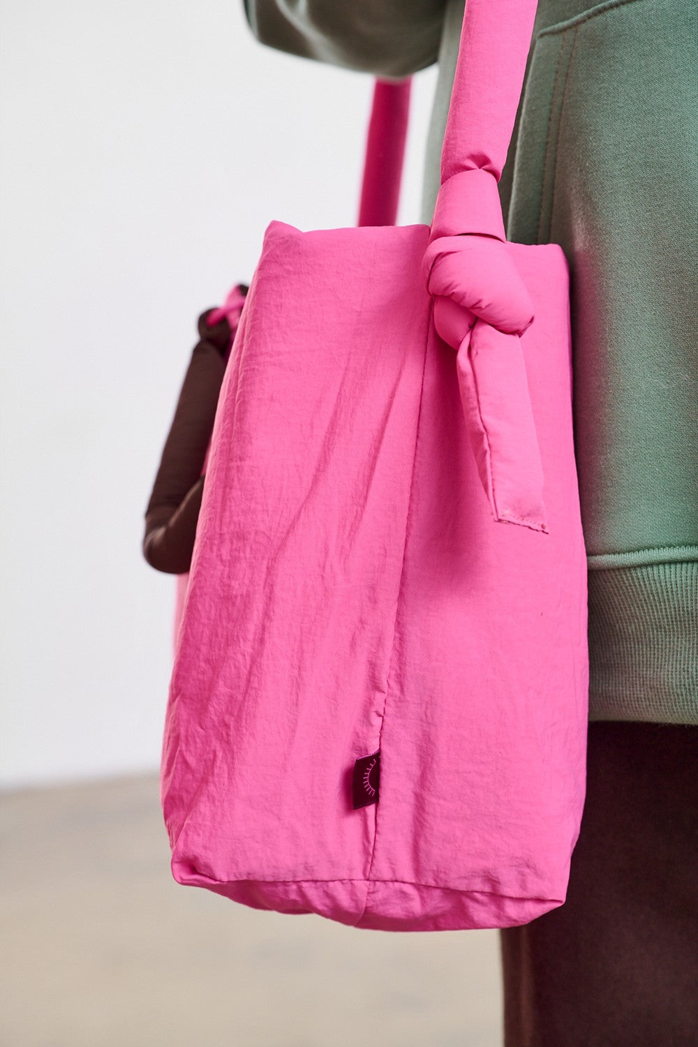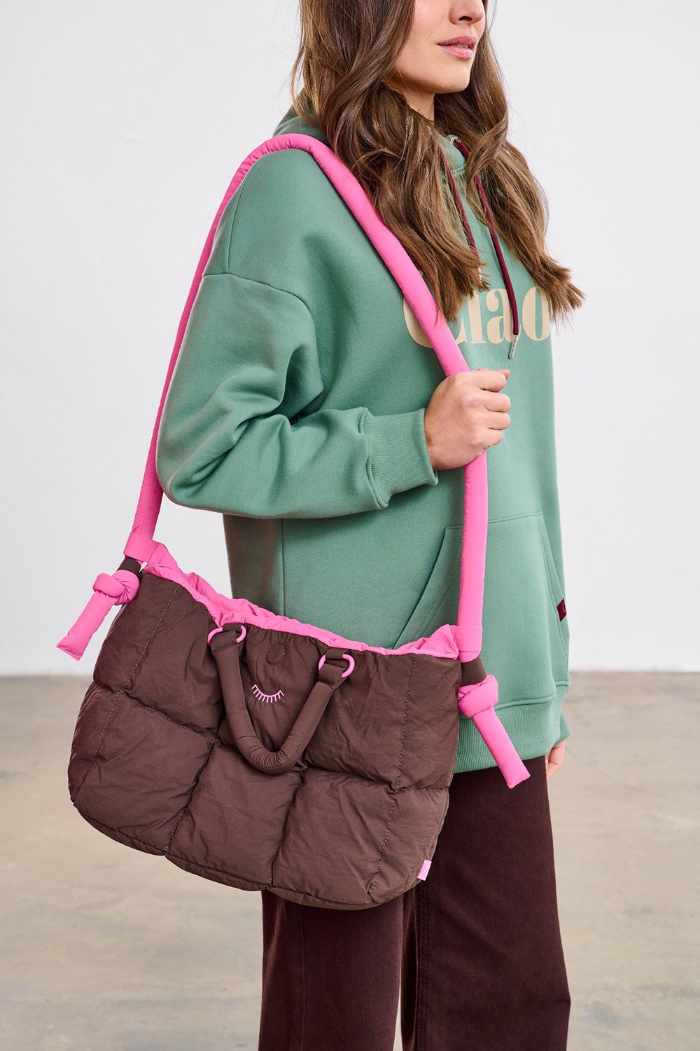 El bolso no solo es hermoso, sino también funcional. El diseño suave y acolchado es ligero y espacioso. Tiene dos juegos de asas: cortas, marrones para llevar en la mano, y largas, rosas para el hombro, con lazos decorativos. Es un accesorio que se adaptará perfectamente a ti.