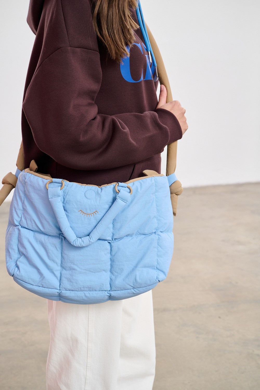 Bolso Sky Match es un maestro de la adaptabilidad. Este modelo de "shopper" acolchado y reversible te permitirá cambiar de estilo en un segundo. ¿Te apetece paz y tranquilidad? Elige el lado azul cielo. ¿Necesitas un clásico? Dale la vuelta al elegante marrón.