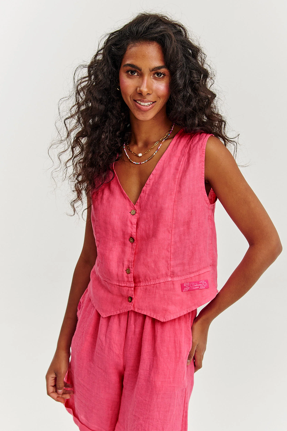 El chaleco de lino Pink Sands es una opción para las #naokogirls que aman el estilo relajado del verano. Su color energético atrae las miradas y el lino natural y transpirable brinda total comodidad al vestir.