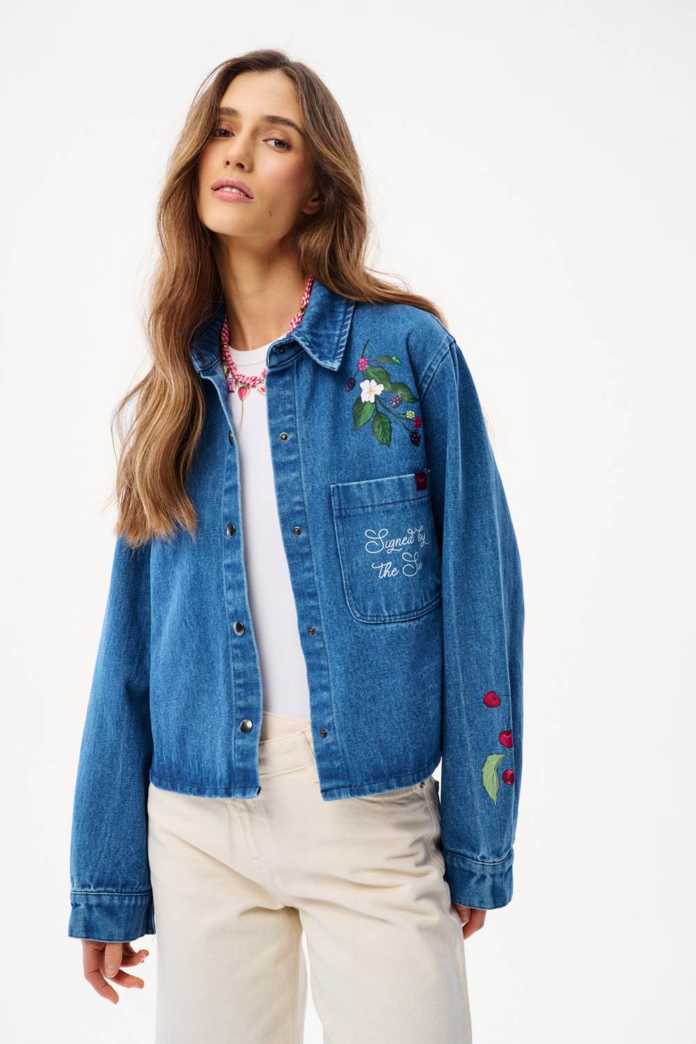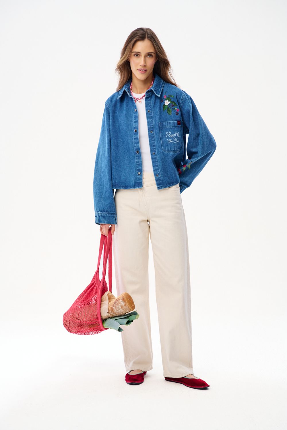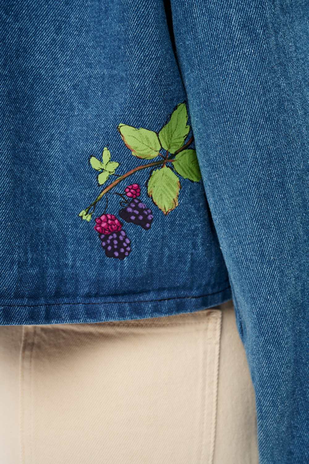 The Spring Treasures denim shirt is a modern take on the classic denim jacket. The cropped style with a collar and pocket is adorned with beautiful embroidery depicting spring fruits—cherries and berries. It’s a design that combines the durability of denim with the delicacy of nature.