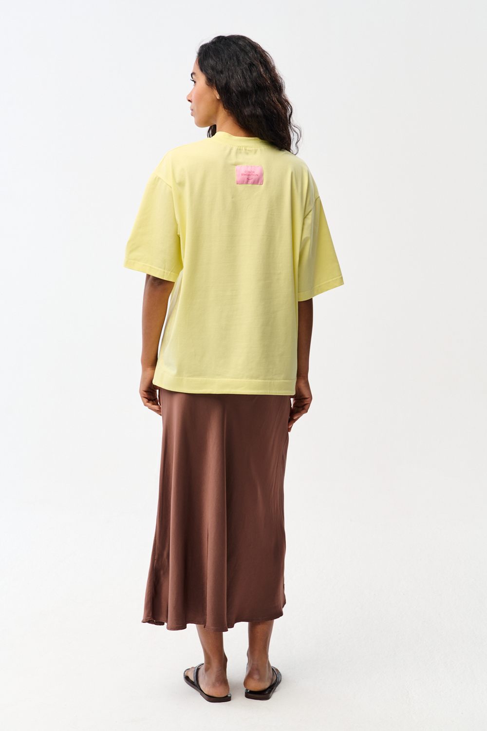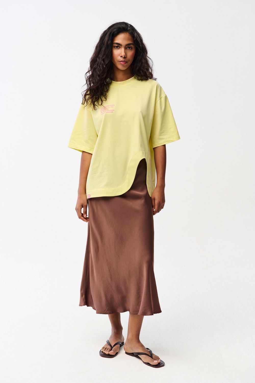 The Best Decisions T-shirt catches the eye not only with its inspiring slogan, but above all with its modern cut. The unique slit at the bottom of the front adds a touch of lightness and gives the classic silhouette a fresh new look. The soft, pastel yellow knit fabric is the perfect choice for warmer days.
