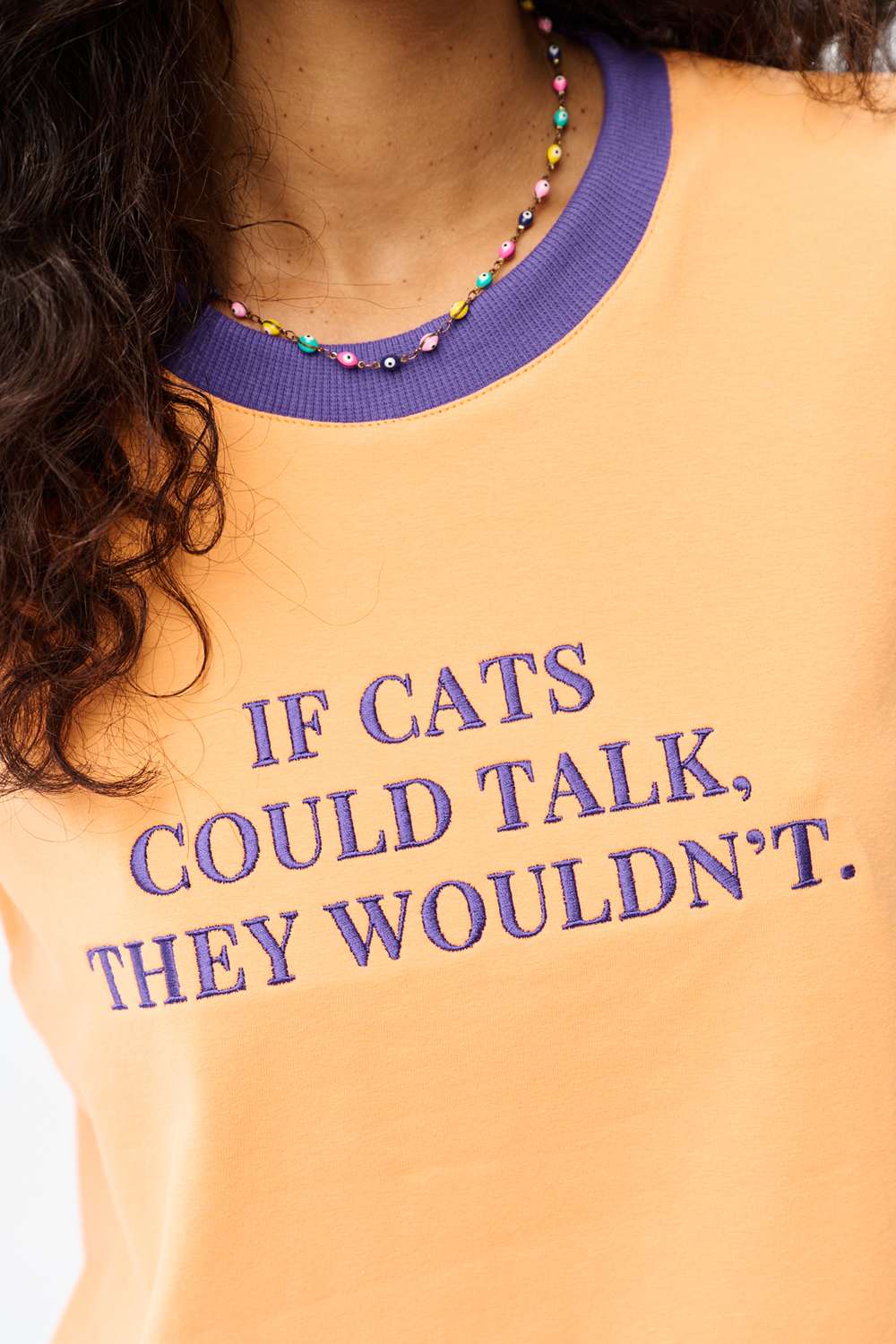 The Silent Whiskers T-shirt is a tribute to tranquility and feline nature. The peach-colored fabric perfectly complements the purple neckline trim and the embroidered phrase “If cats could talk, they wouldn’t." It’s a minimalist design with character that speaks louder than a thousand words.
