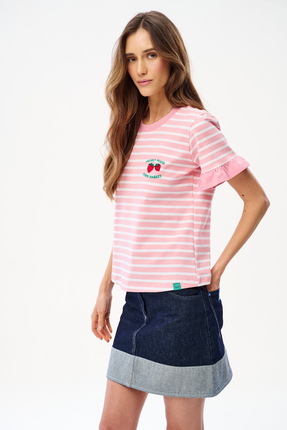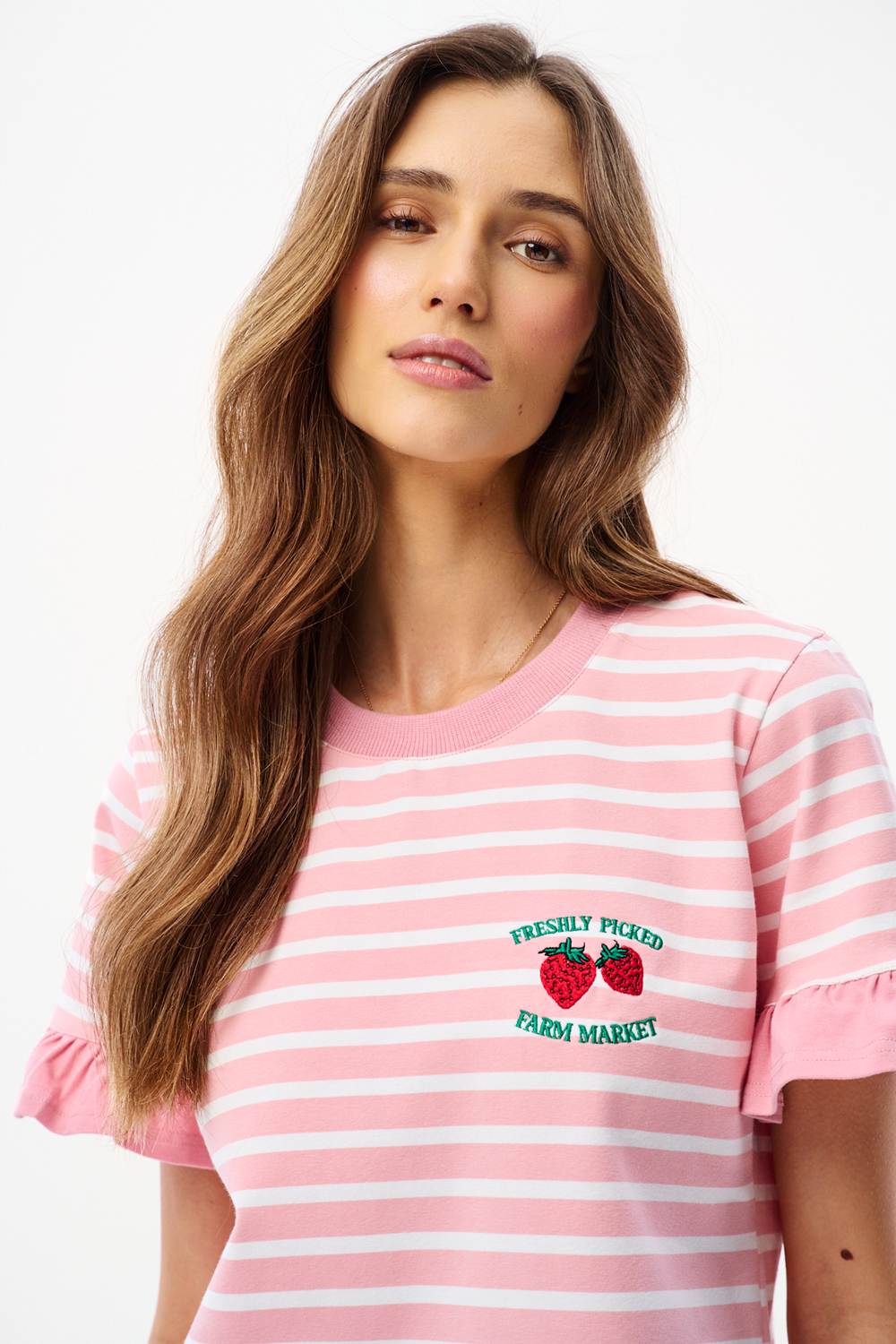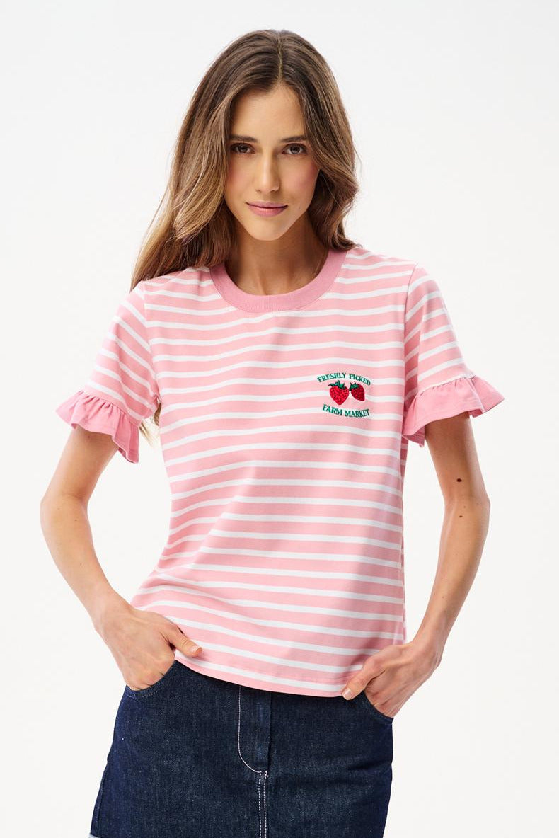 The Strawberry Fields T-shirt combines a classic design with romantic details. The pink and peach stripes give it a summery vibe, while the ruffles on the sleeves transform an ordinary T-shirt into a unique fashion statement. Soft cotton ensures comfort all day long.