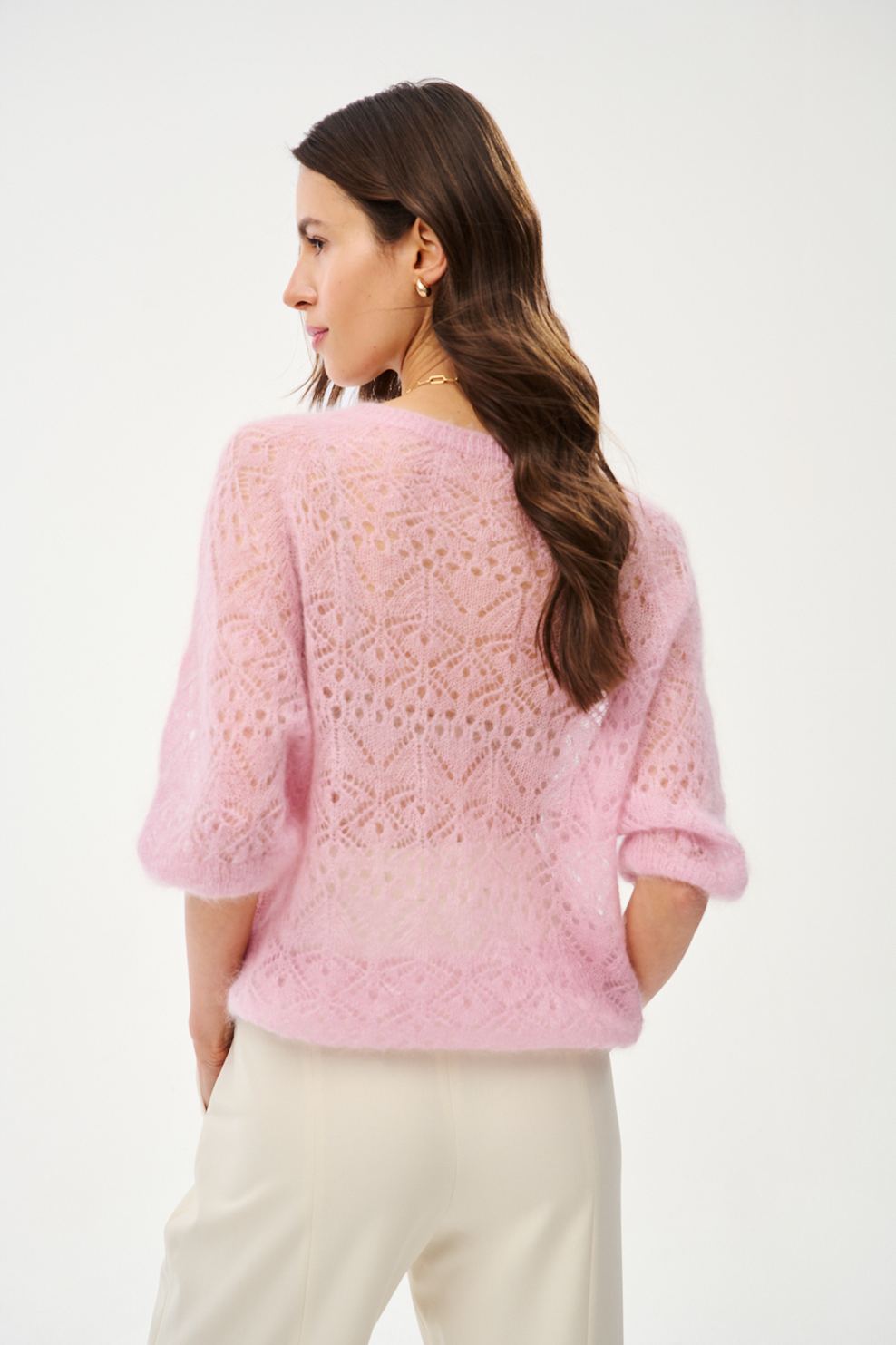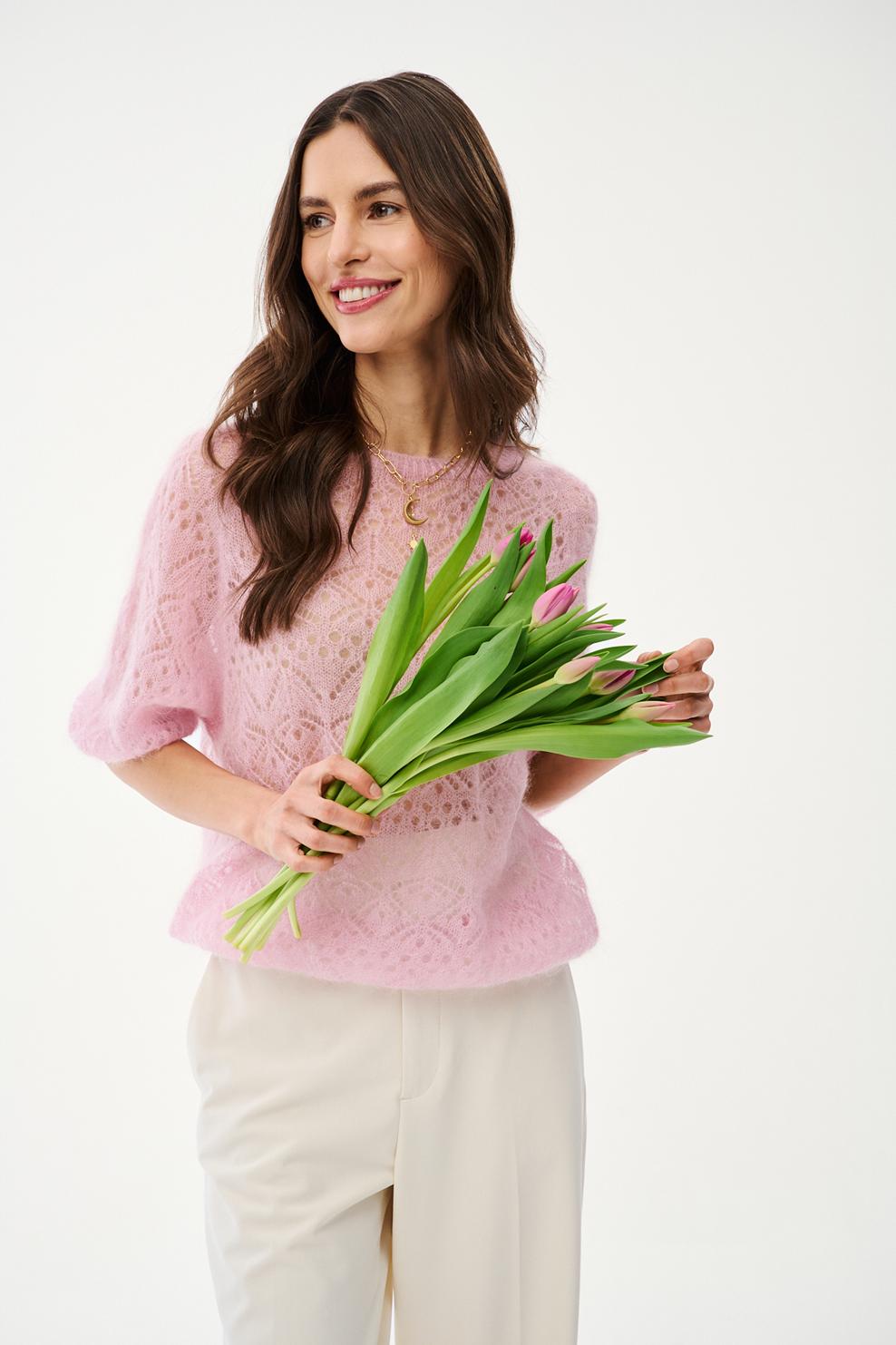 Rosebeam-neule on herkkyyden ruumiillistuma. Pehmeästä langasta, jossa on ripaus mohairia, valmistettu neule kietoutuu vartalon ympärille kuin pilvi. Virkattu kuviointi antaa sille retrohenkisen ilmeen, joka sopii täydellisesti nykytrendeihin. Puuterinvaaleanpunainen sävy korostaa asun tyttömäistä viehätystä.