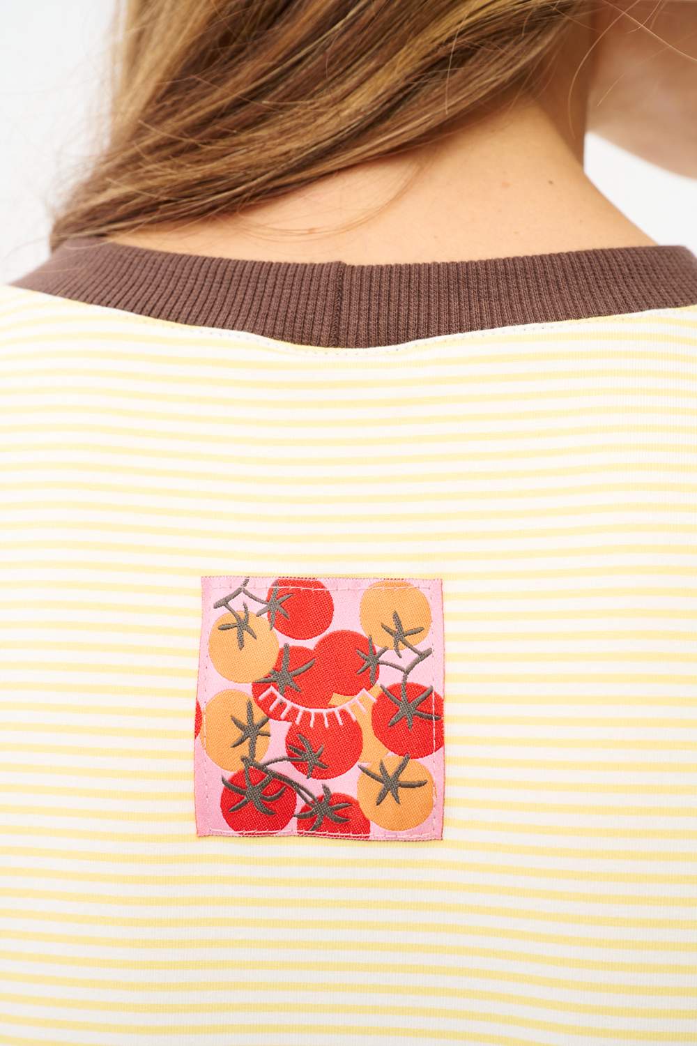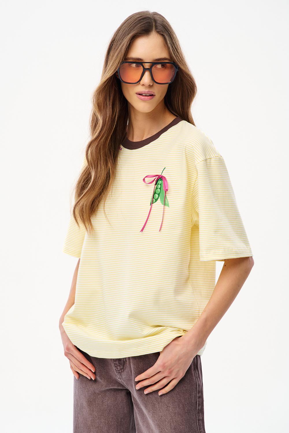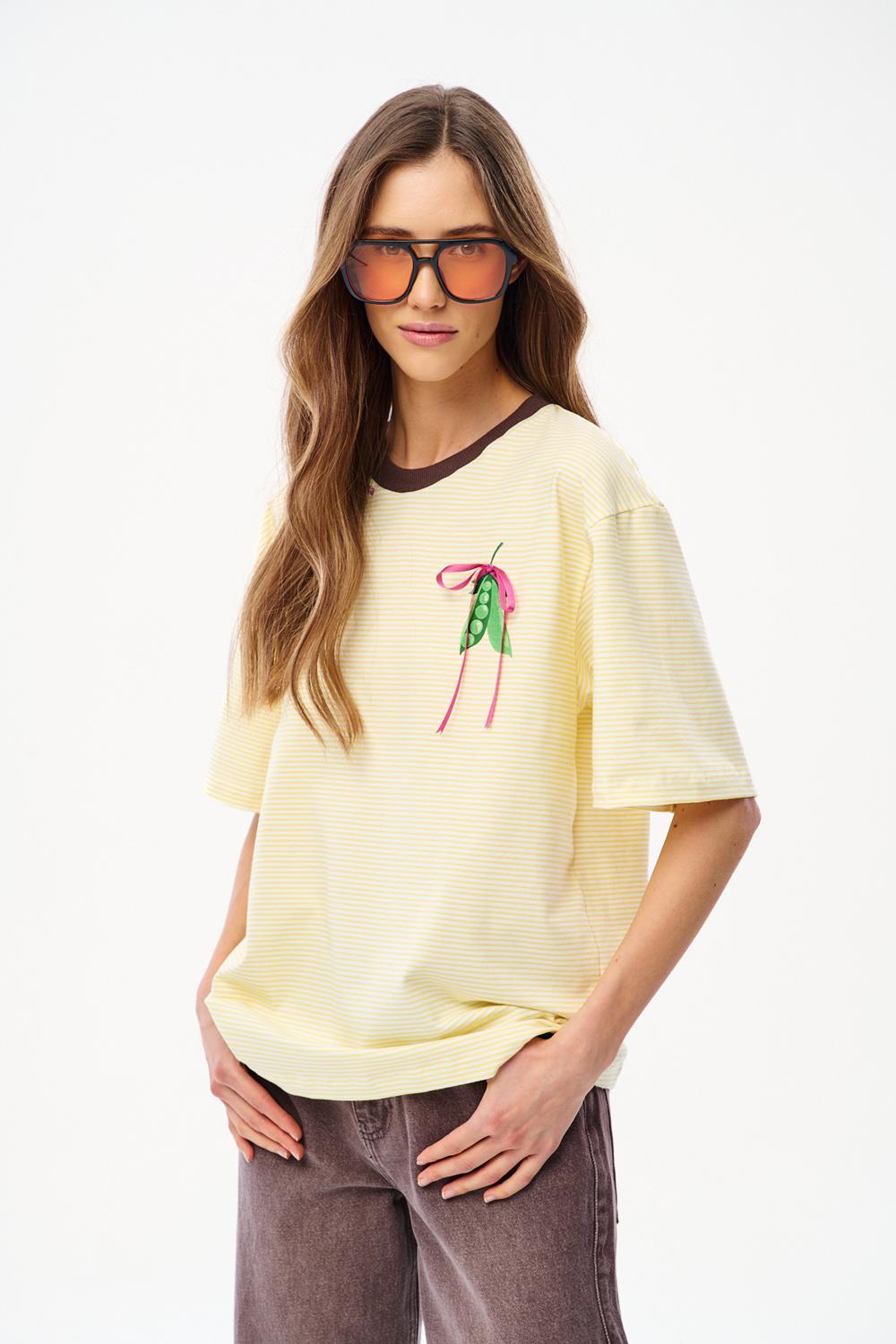 The "Peas Over Drama" T-shirt, featuring delicate yellow stripes, stands out with its charming pea print and a sewn-on pink bow. The "Peas over drama" slogan is a fashion statement of peace and joy. The brown ribbing at the neckline gives it a slight vintage vibe.