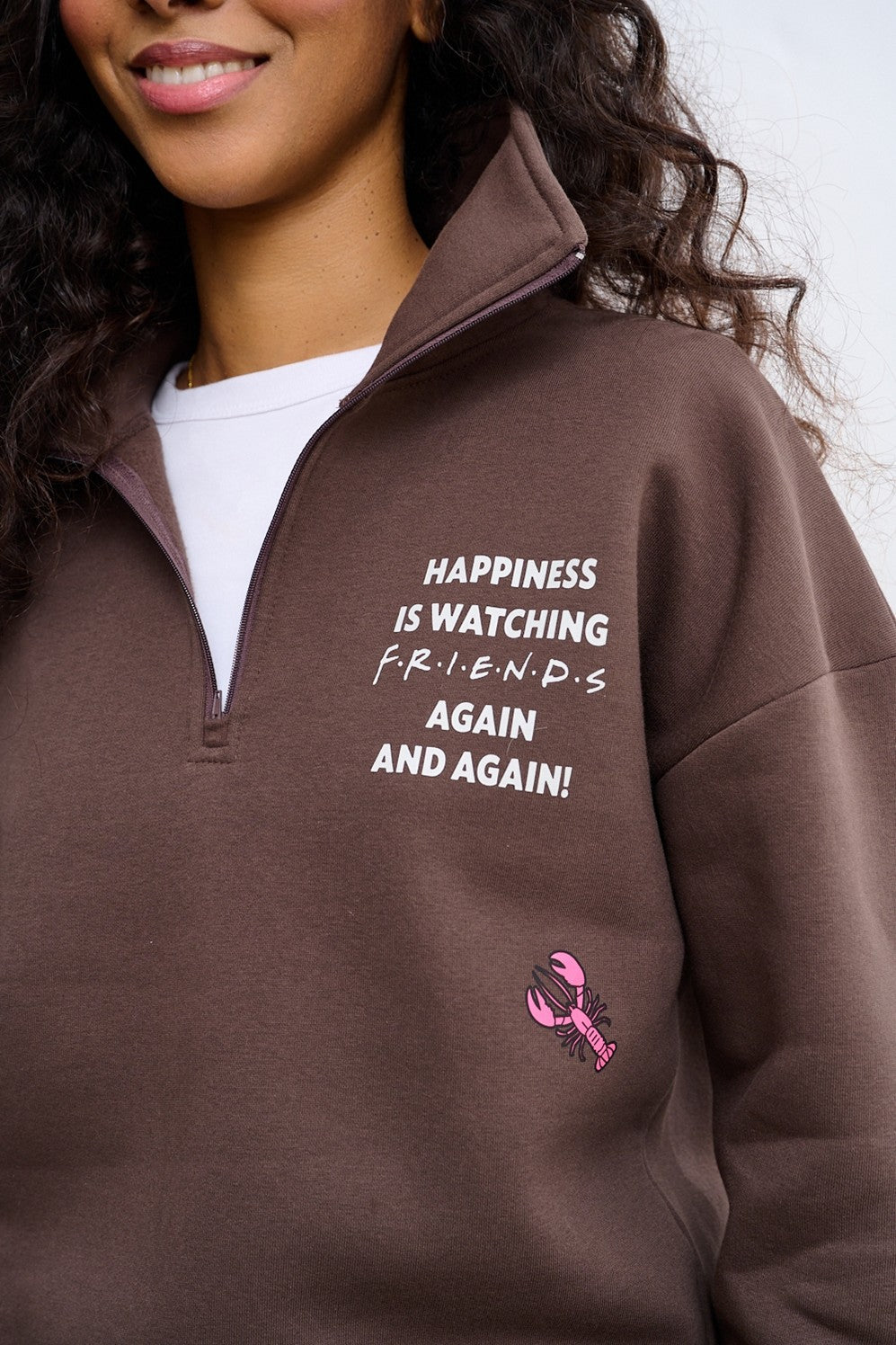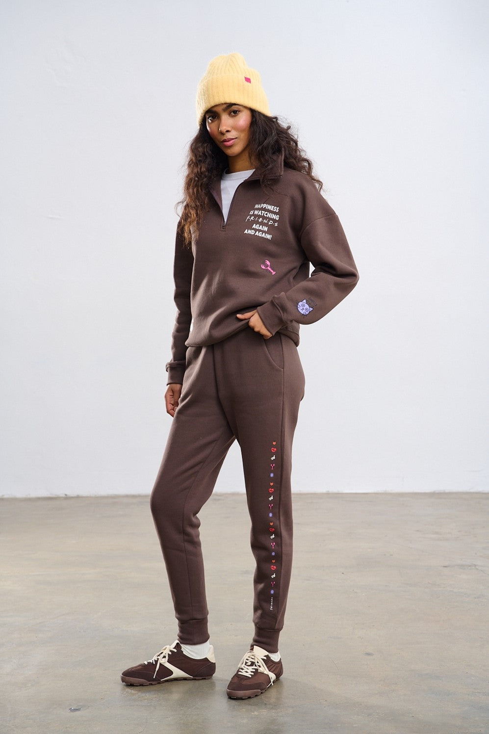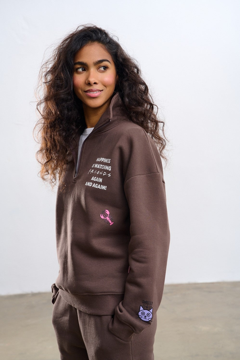 The Watching Friends sweatshirt is the perfect piece for lazy afternoons. Made of soft, deep brown knit fabric, it features a fashionable collar and zip fastening. The straight cut ensures comfort, and the cuffs maintain their shape.