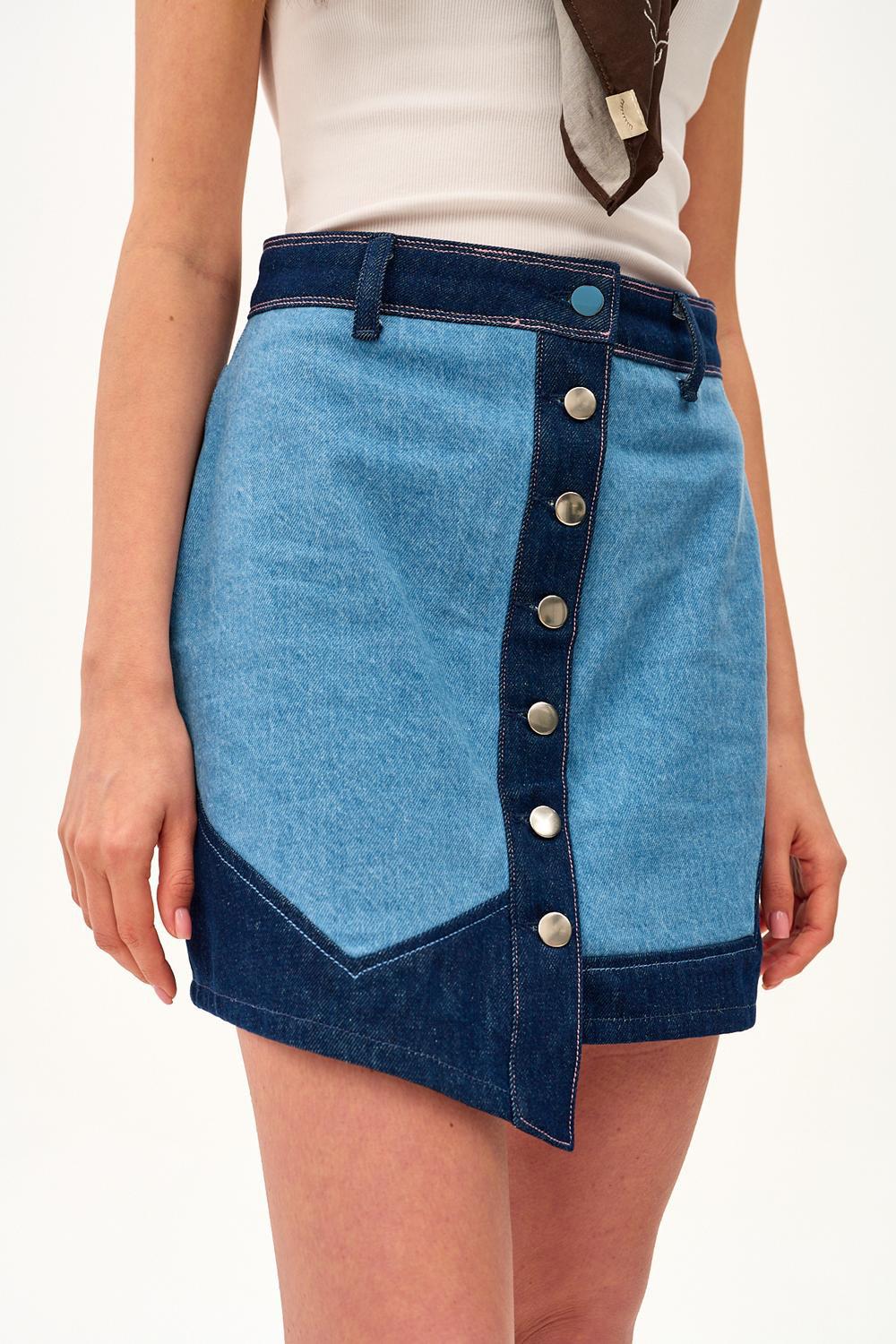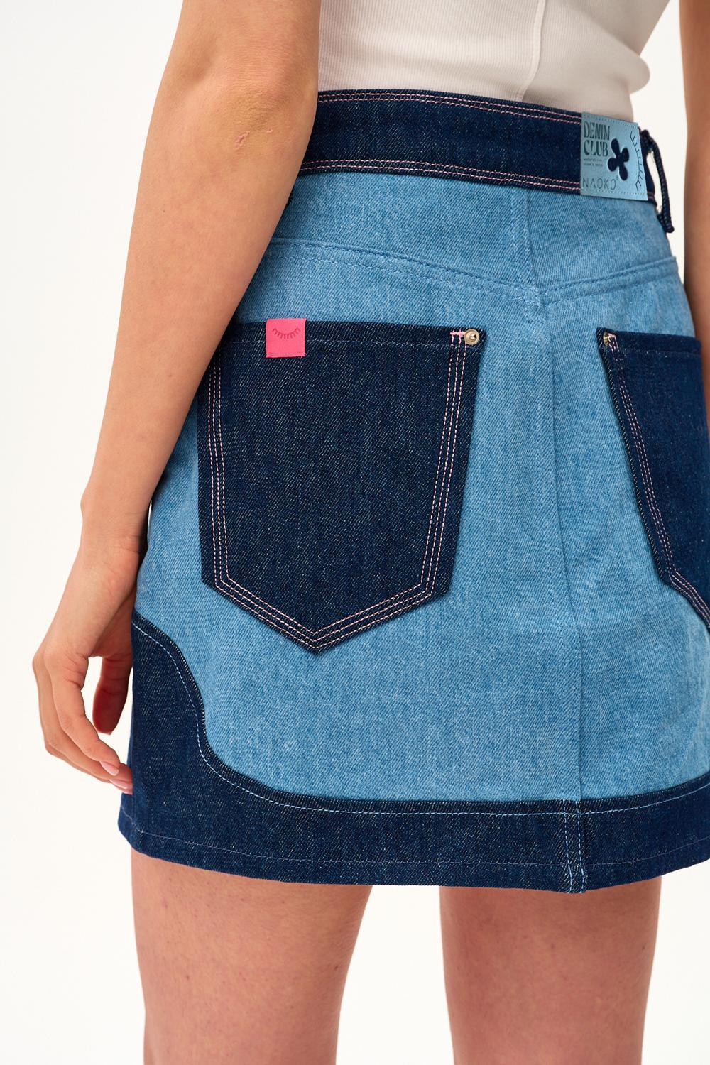 La jupe en jean Desert Rose est un modèle que vous ne pouvez tout simplement pas ignorer. La combinaison de deux nuances de denim – bleu clair et bleu foncé – crée un effet visuel dynamique. La fermeture boutonnée asymétrique à l’avant et les surpiqûres roses ajoutent de la féminité et de la légèreté.