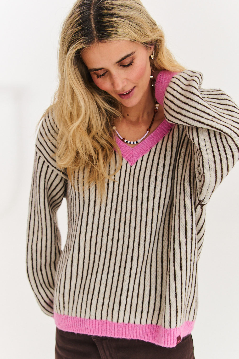 Le col en V profond met magnifiquement en valeur le cou et les clavicules, tandis que le passepoil rose ajoute du caractère. Les manches amples terminées par de larges poignets soulignent la coupe décontractée du pull. Confectionné dans une maille douce, il s’associe parfaitement à un jean ou une jupe.