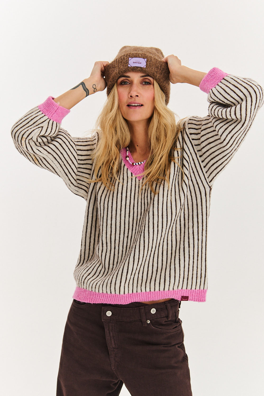 Le pull Pillow Talk est la quintessence du confort avec une touche de mode. Ce modèle à coupe décontractée séduit par un motif classique de petites rayures contrastées. Cependant, son caractère est entièrement construit par les détails – des poignets roses saturés.