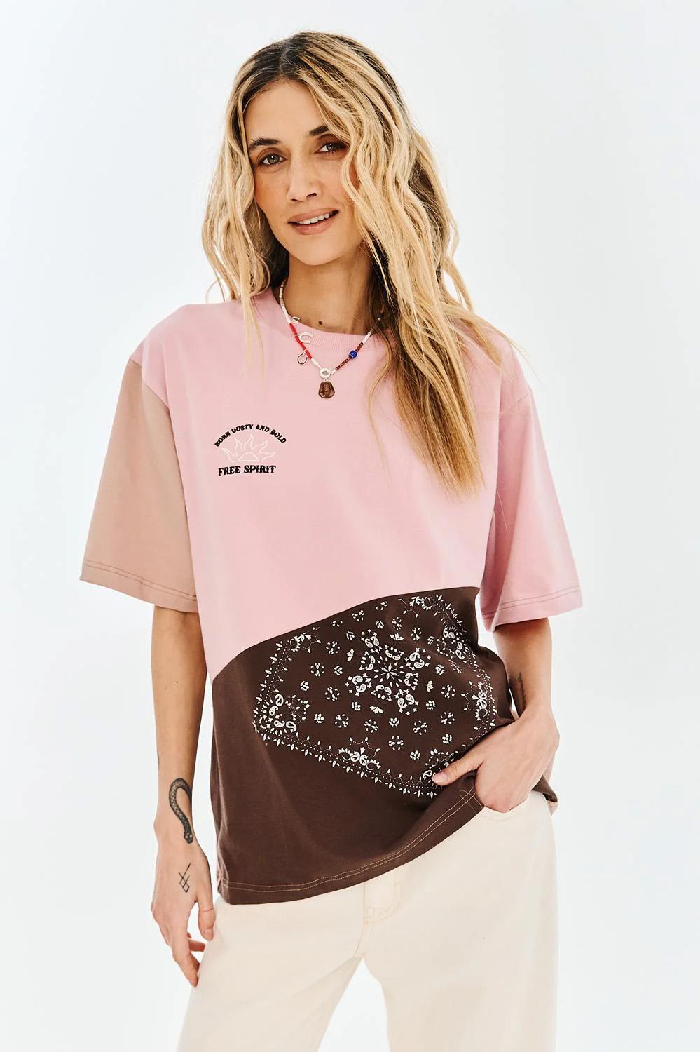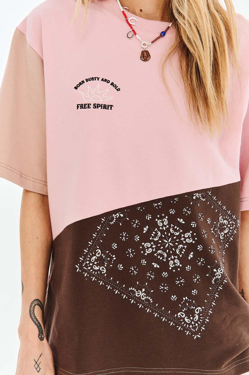 Le T-shirt Dusty Spirit est une proposition pour les rêveurs et les esprits libres. L’association inhabituelle de rose poudré, de brun profond et d’un motif bandana crée un ensemble unique. L’inscription brodée « Free Spirit » et les graphiques subtils de soleil lui donnent une expression artistique.