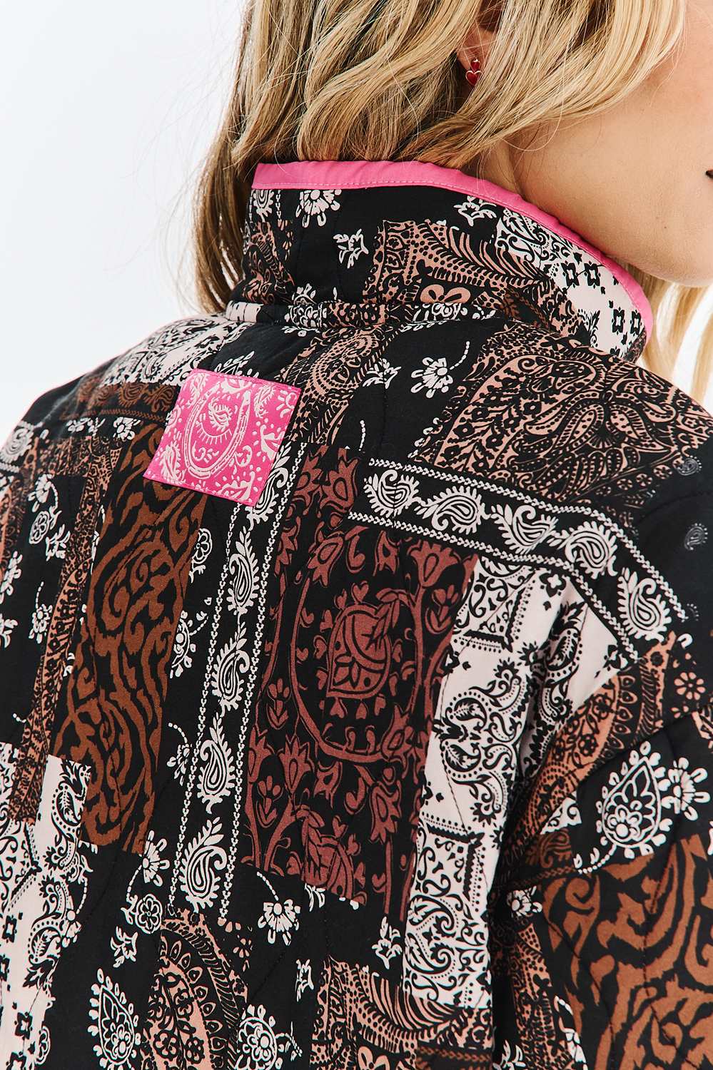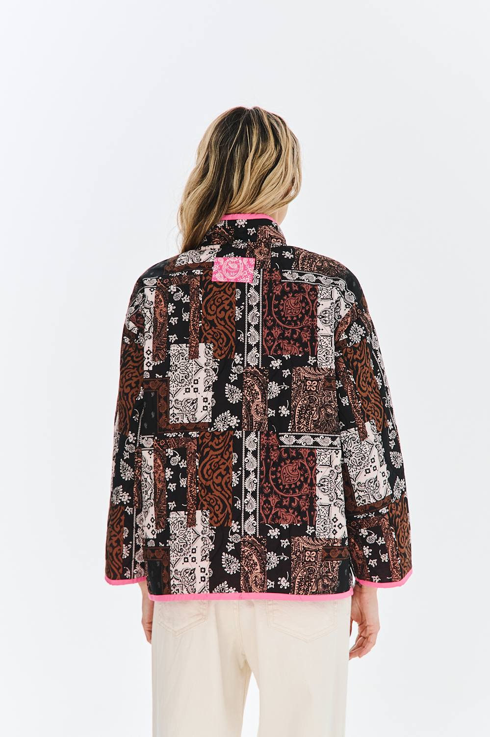 La veste Western Story rend hommage à la cowgirl moderne. Son design patchwork saisissant, orné d’un motif cachemire dans des tons de marron, noir et beige, est rehaussé par un passepoil rose fluo contrastant. C’est un modèle impossible à ignorer, qui combine style traditionnel et couleurs audacieuses.