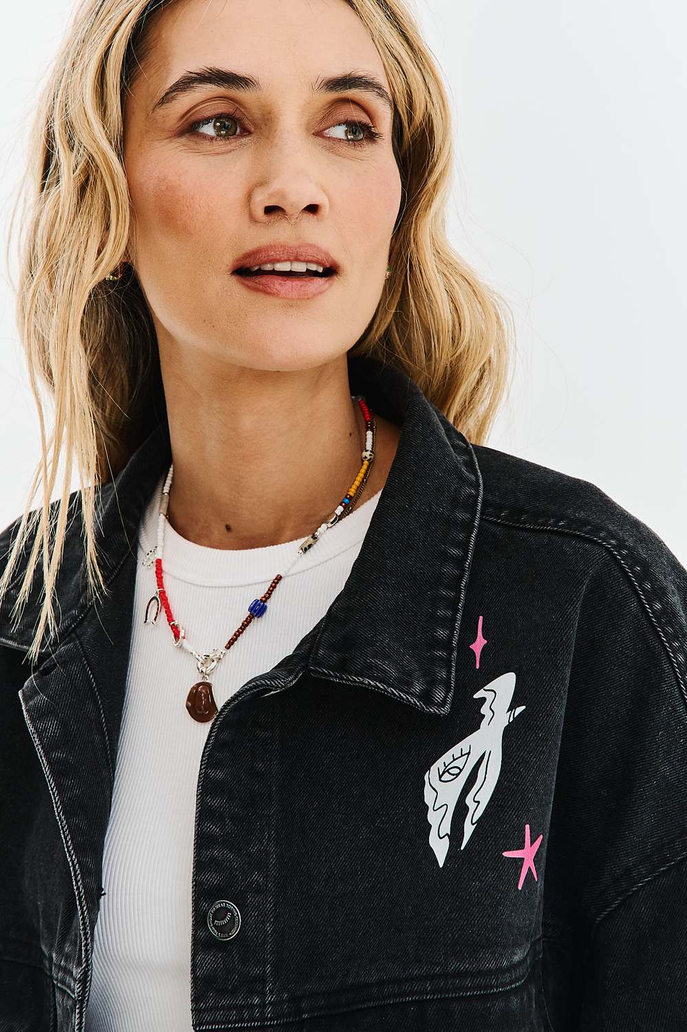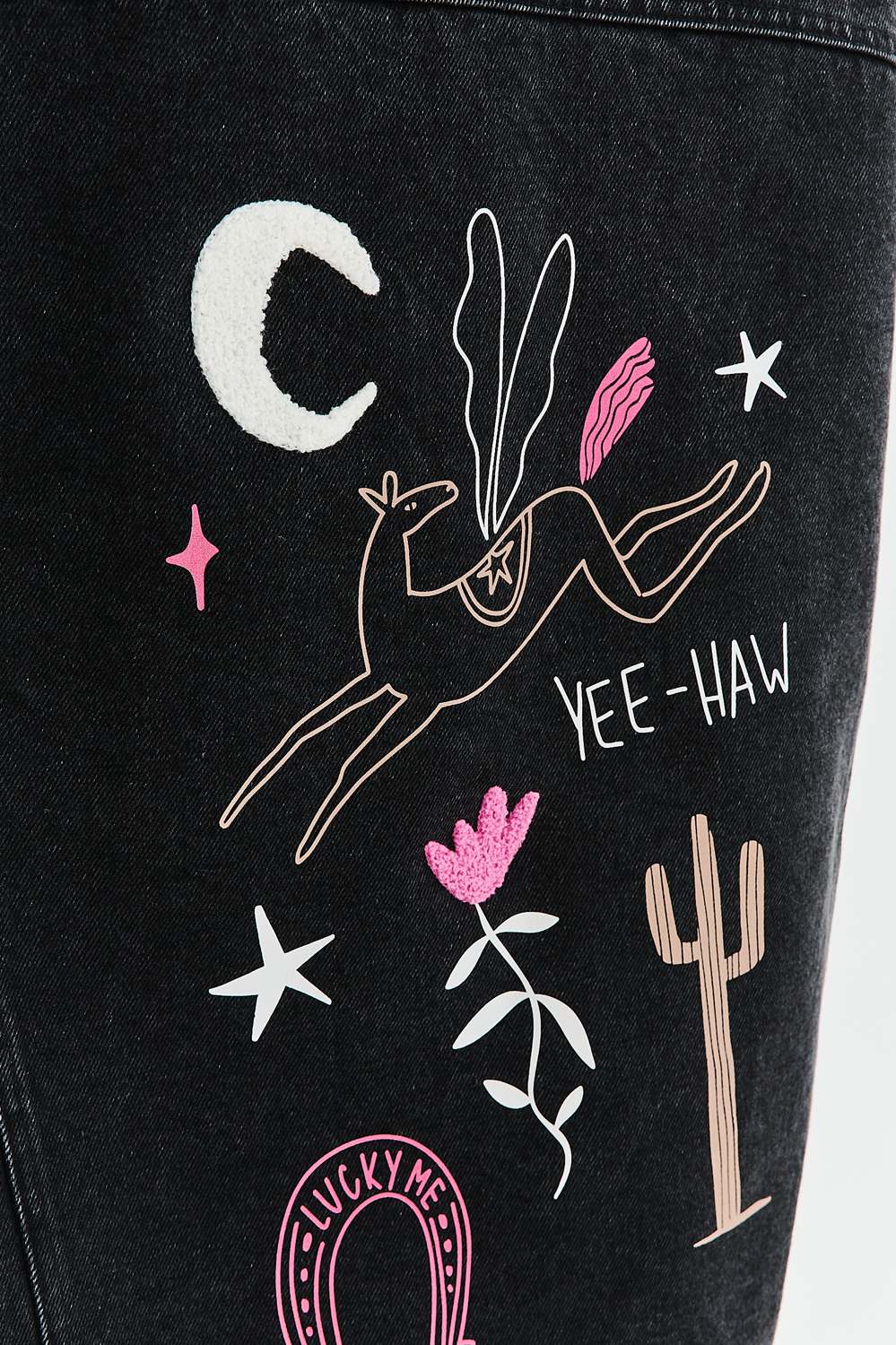Ce n’est pas une veste ordinaire. La Yeehaw Dreams attire tous les regards grâce à ses détails : des étoiles blanches et des éclairs sur les manches à la composition élaborée et colorée dans le dos, mettant en scène une lune, un cactus et le mot « YEE-HAW ». La veste est dotée de poches poitrine pratiques et de boutons métalliques. Elle se porte parfaitement avec un jean patchwork pour un look audacieux et assumé, ou en surchemise sur une robe bohème fluide.