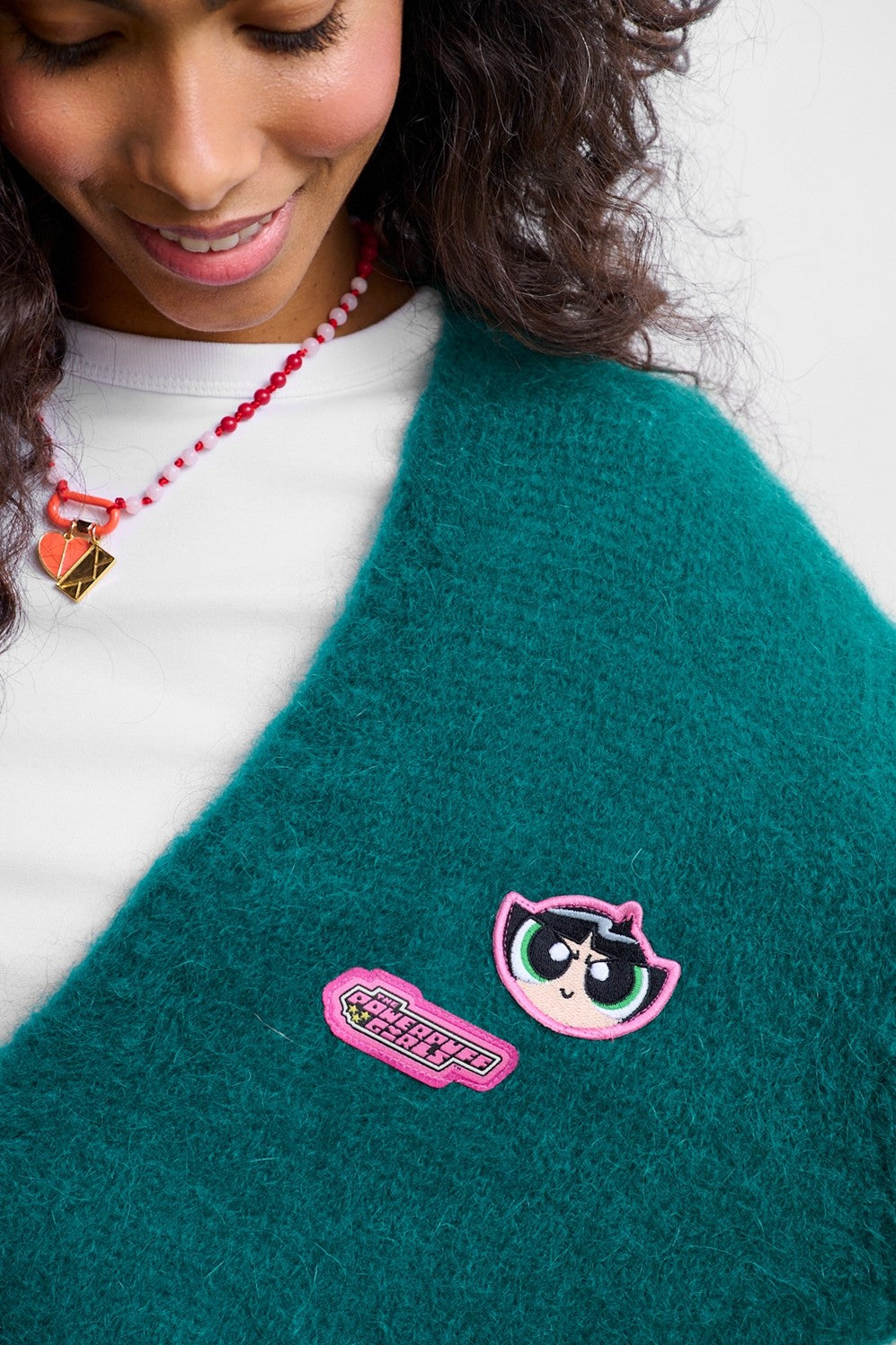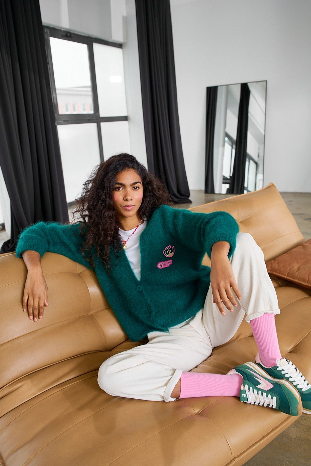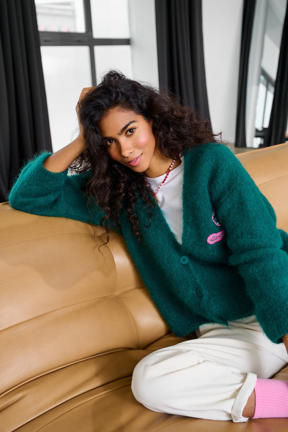 The Buttercup Mohair Cardigan combines a classic design with a touch of rebellion. Made of soft, fluffy yarn with added mohair, in a beautiful deep green color. Fastened with buttons and featuring a V-neck, it works perfectly as a cover-up.