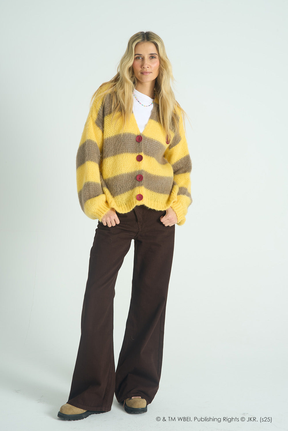 The Gryffindor Spirit Mohair Cardigan is a choice for the brave and noble. The classic V-neck design with button closure is enhanced by wide stripes in Gryffindor's signature colors. The addition of mohair makes it soft and warm.