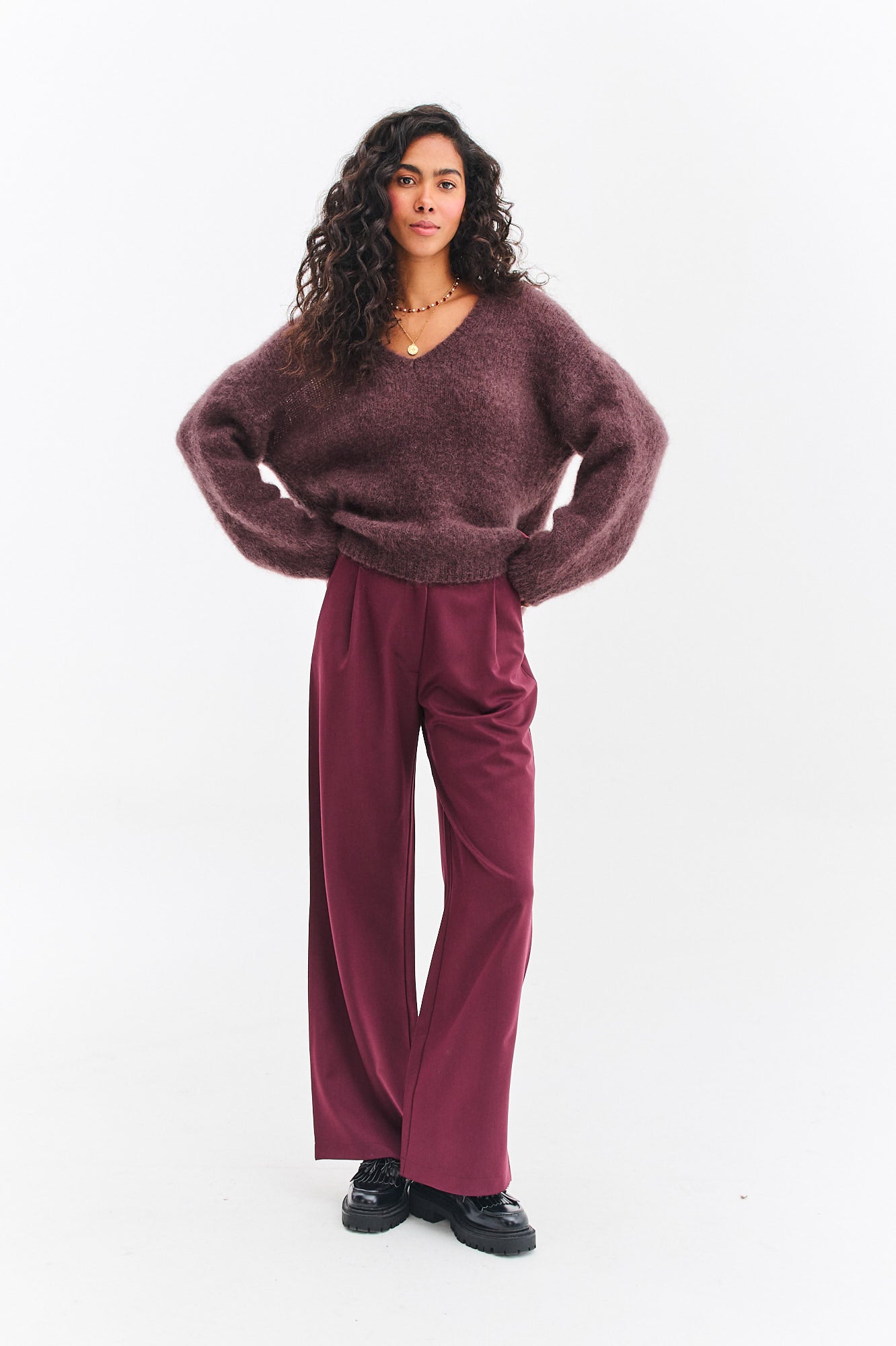 Kiss the Silence wide-leg pants are for women who appreciate style and comfort. They have a high rise, which optically lengthens the legs, and a fashionable wide leg. The deep burgundy color adds nobility to them and makes them a perfect base for many stylings.