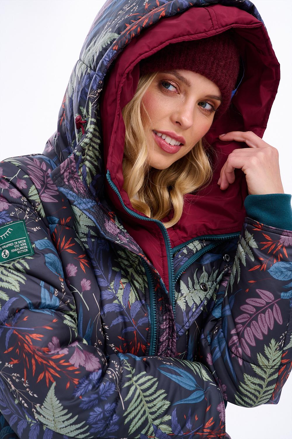 La giacca invernale Misty Woods è la perfetta combinazione di funzionalità e design unico. Il taglio più lungo e l’isolamento solido garantiscono calore, e la stampa botanica "Aurora Forest" le conferisce un carattere unico. Un ampio cappuccio con fodera a contrasto protegge dal freddo e aggiunge un tocco misterioso al tuo look.