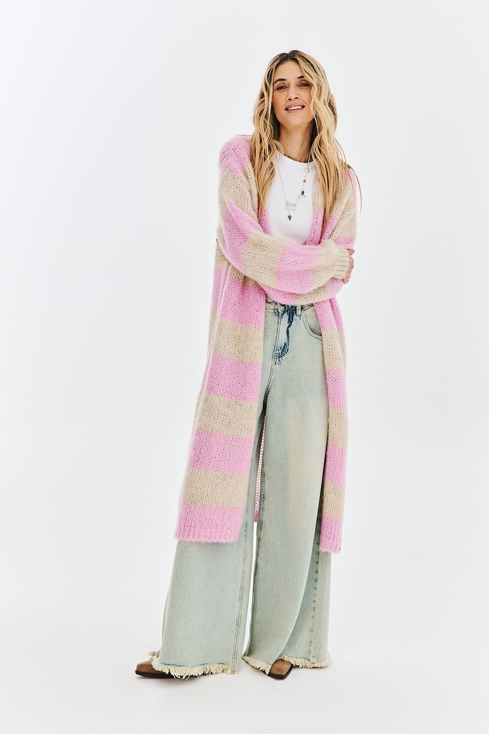 The Strawberry Shake Long Cardigan is a combination of warm beige and delicate pink, reminiscent of a summer dessert. The loose, unfastened cut makes it the perfect cover-up for any season, providing warmth and a stylish look.