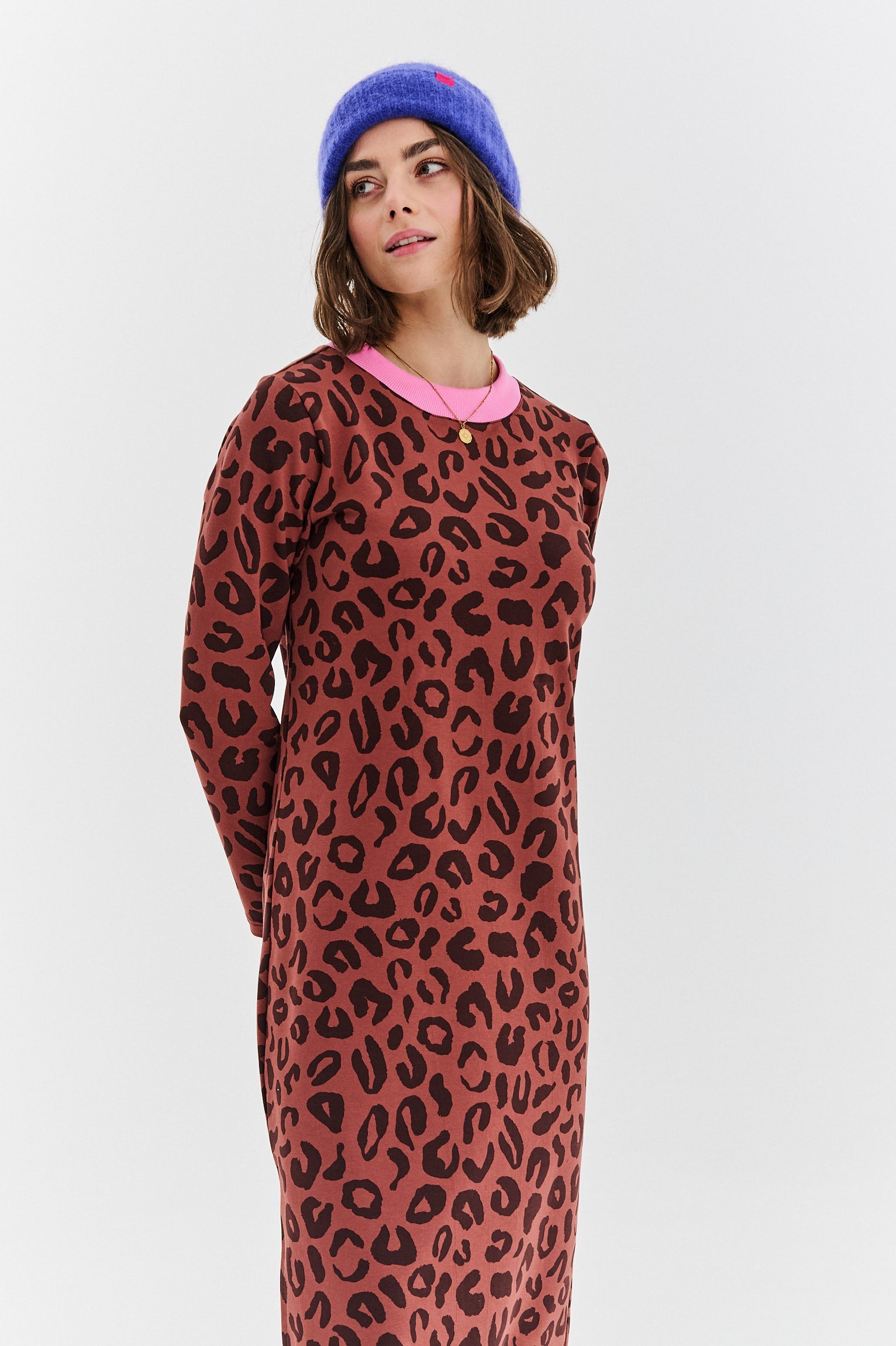 La stampa leopardata senza tempo è spezzata da una decisa finitura rosa sullo scollo, creando un effetto unico e moderno. Questo è un abito che non ha bisogno di molti accessori per fare colpo. Bastano stivali o sneakers per creare un look completo.
