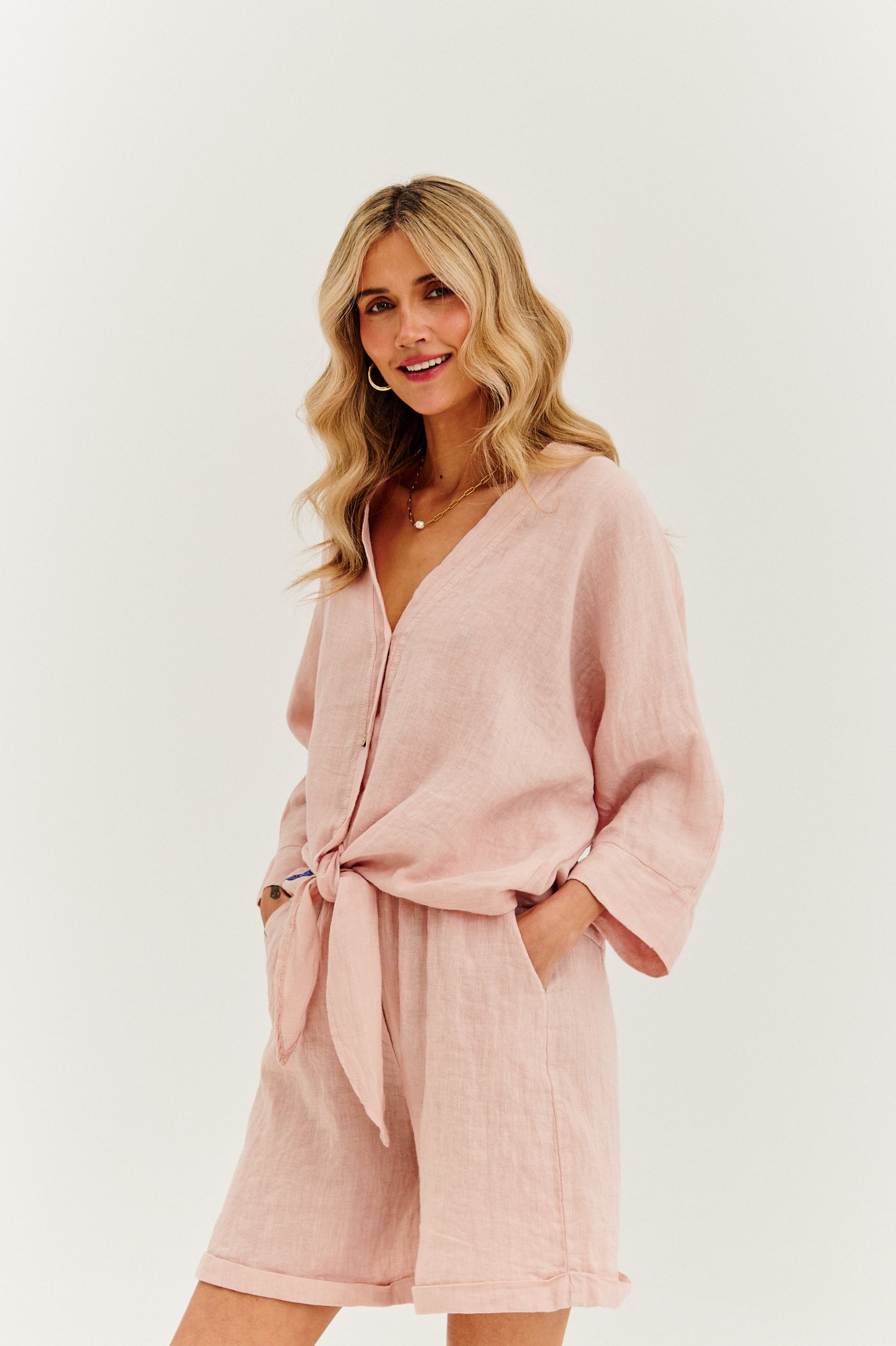 Realizzati in lino traspirante in una tonalità di rosa cipria, sono perfetti per una passeggiata sulla spiaggia, una colazione in giardino o una fuga estiva in città. Abbinali a una giacca della stessa collezione o a una felpa colorata - e senti la leggerezza dell'aria marina, anche nel cuore della città.