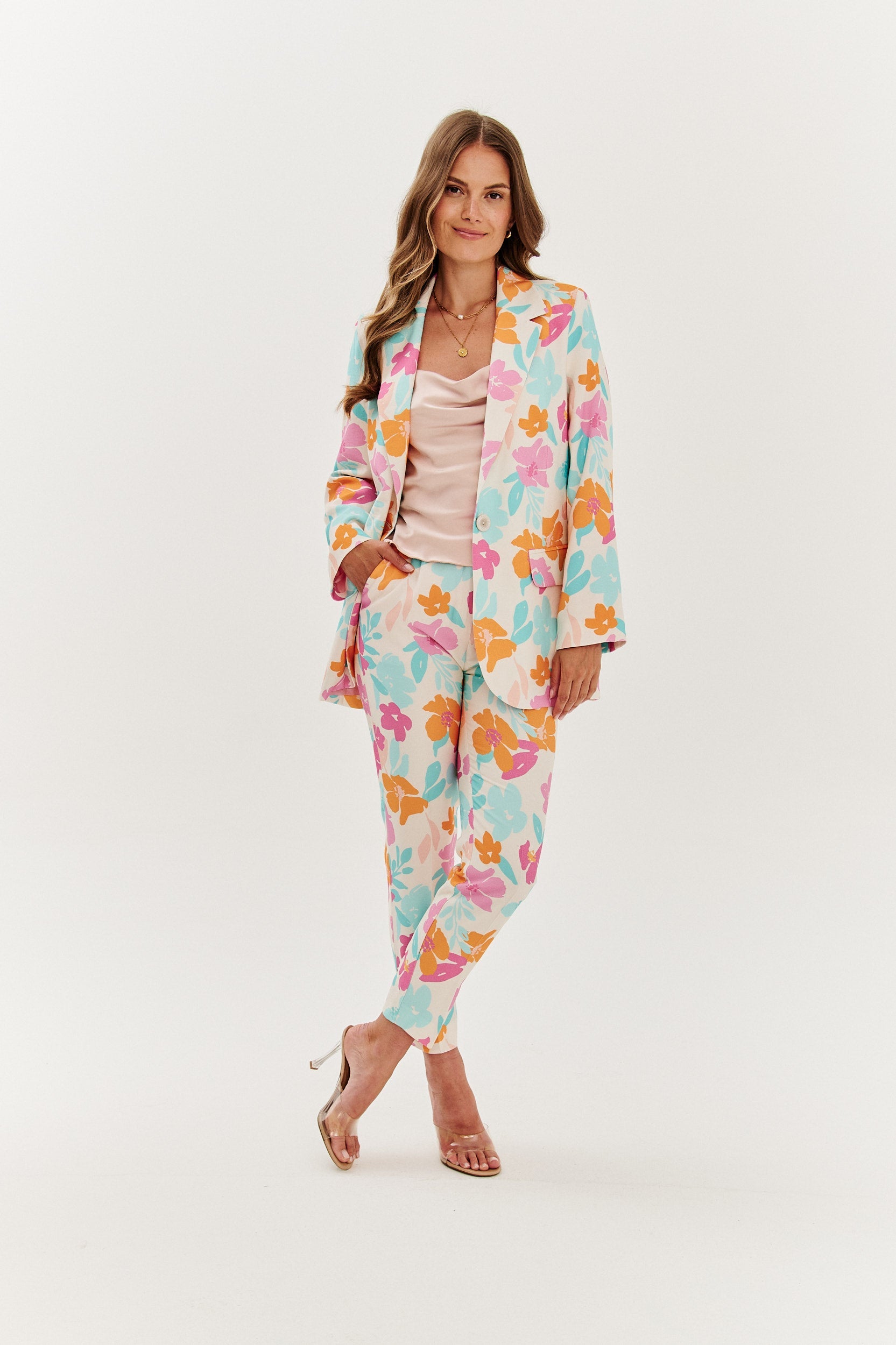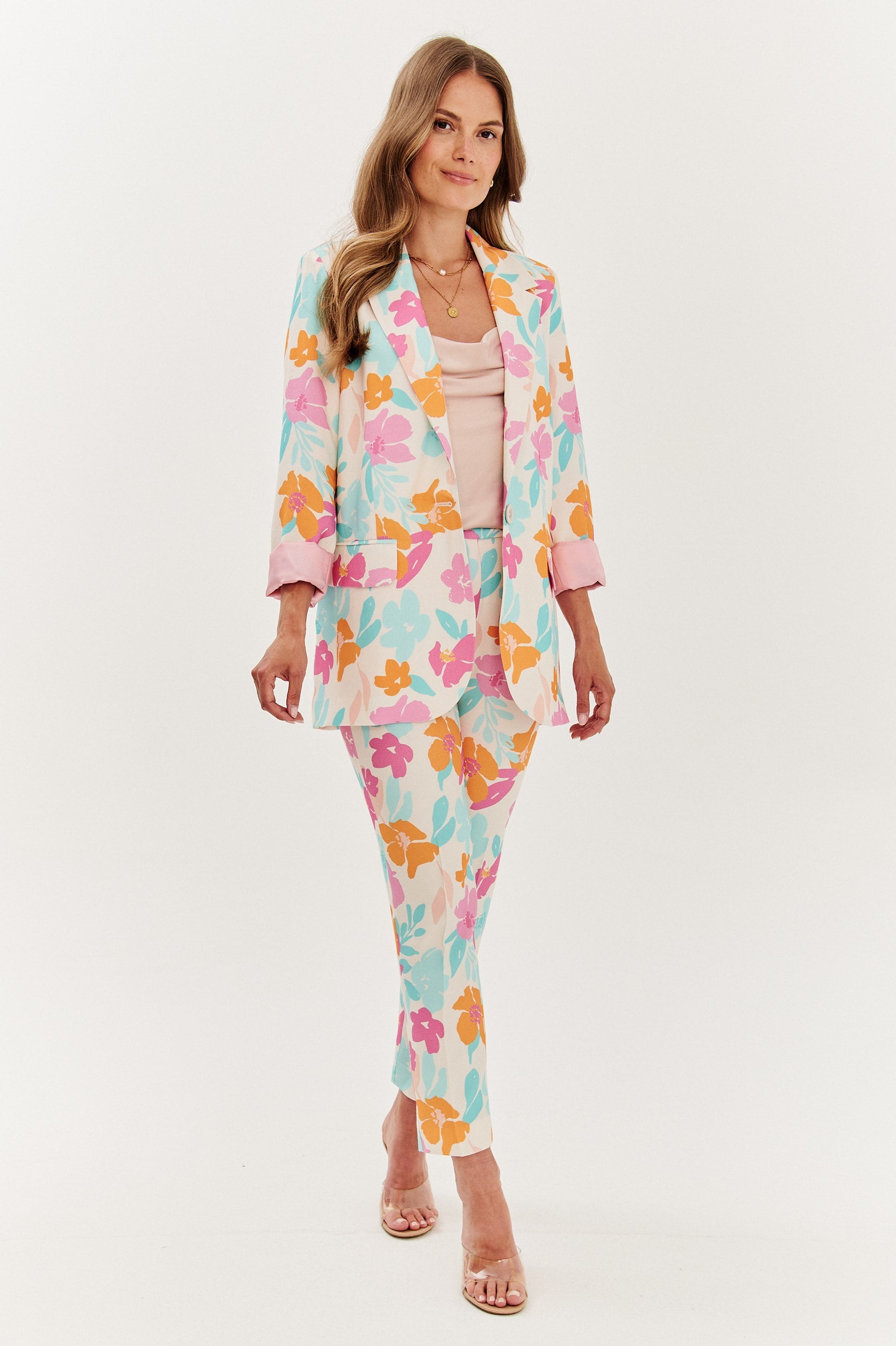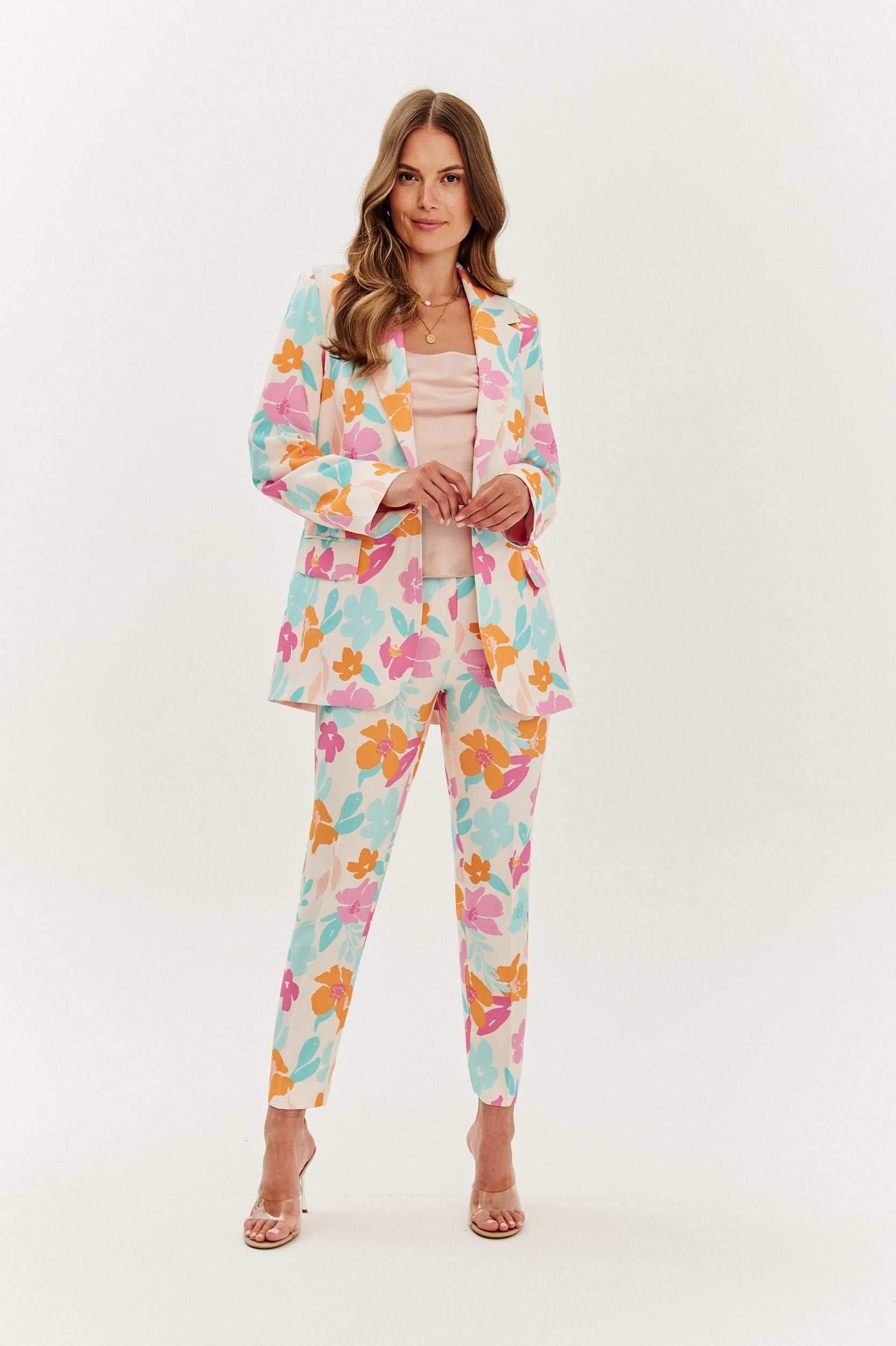 Un modello a taglio dritto con una leggera affusolatura verso il fondo, decorato con una distintiva stampa floreale nelle tonalità del rosa, arancione e turchese. I pantaloni hanno una classica cintura con passanti, chiusura frontale e tasche posteriori: così combinano una vestibilità confortevole con una finitura elegante. Il motivo floreale dona loro leggerezza e ottimismo, abbinandosi perfettamente all'atmosfera delle vacanze.