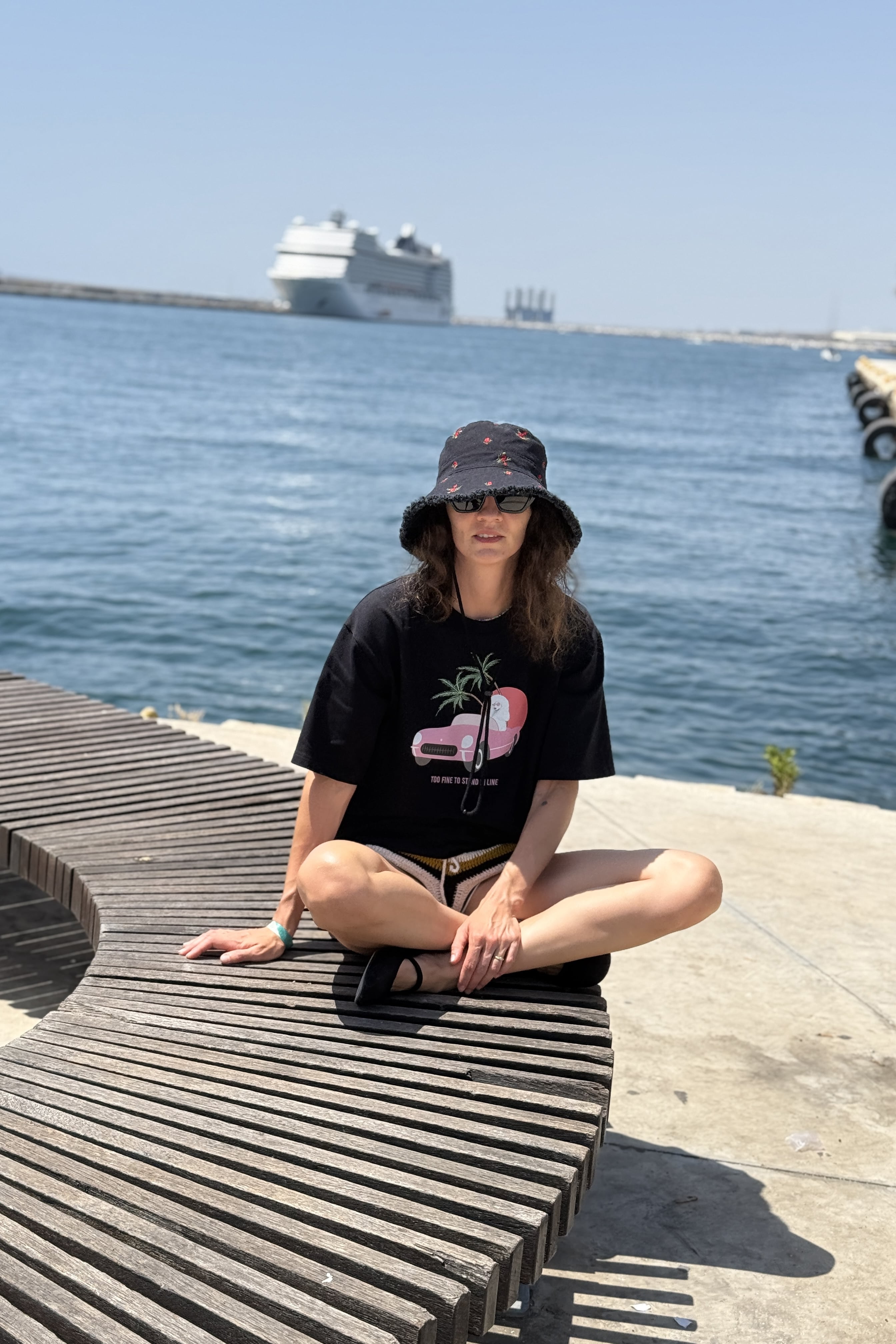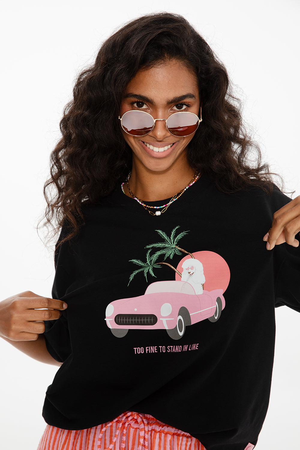Palm Ride T-shirt è una maglietta che dice una cosa: "Troppo in gamba per fare la fila". Sul davanti presenta una decappottabile rosa ricamata, palme e un sole al tramonto - tutto ciò che serve per entrare nell'atmosfera retrò di un viaggio on the road.