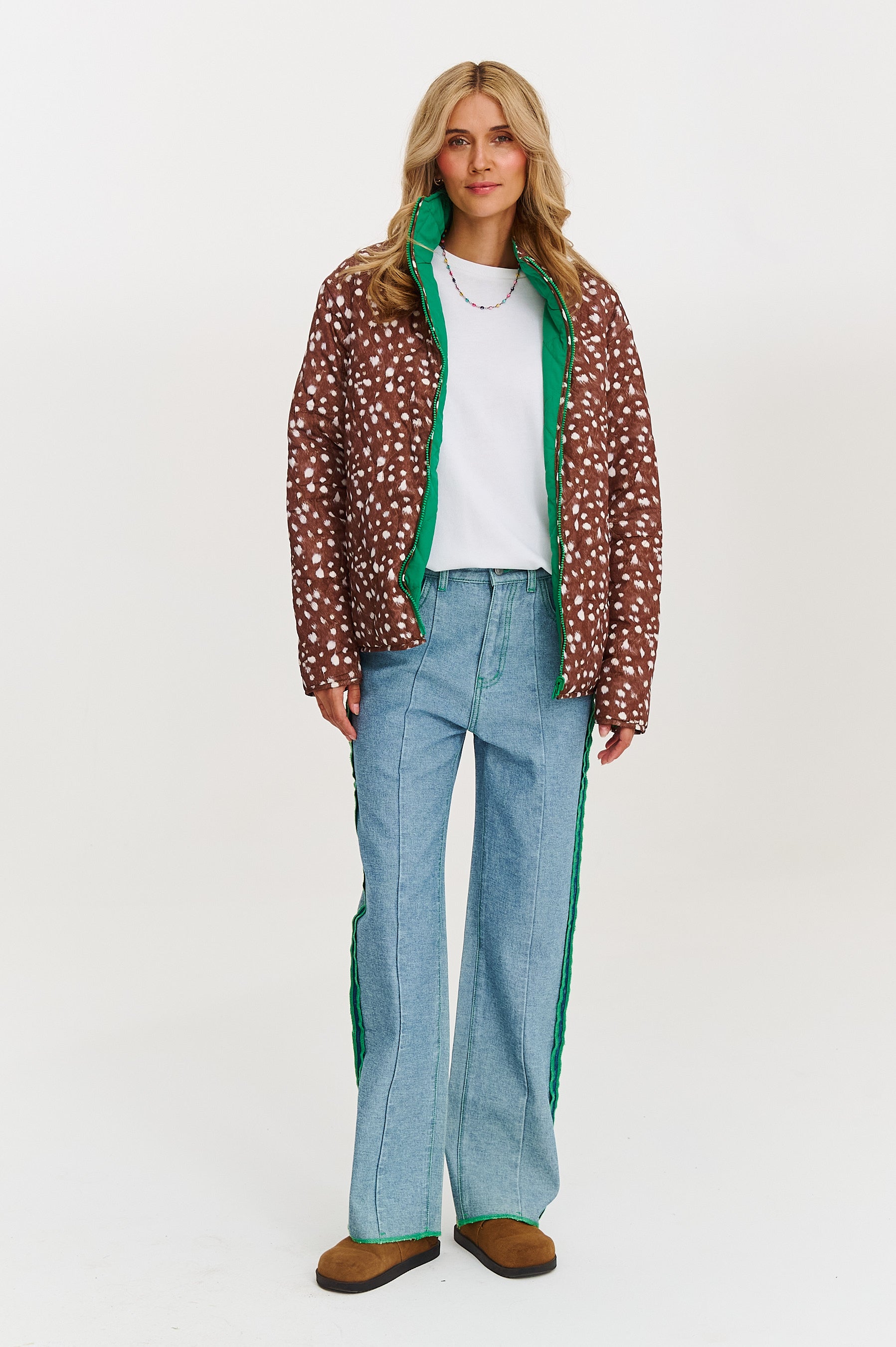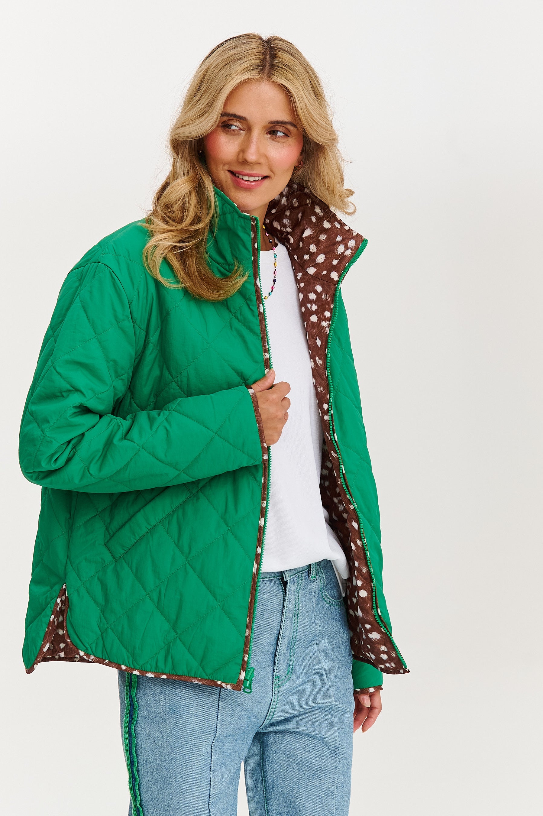 La giacca reversibile Poppy Bambi Mood è una sorprendente combinazione di funzionalità e design originale. Da un lato, conquista con il suo colore verde intenso e uniforme, arricchito da dettagli stampati in stile “bambi”, mentre dall’altro attira l’attenzione con un distintivo motivo animalier in calde tonalità caramello. Lo stile bomber universale, le comode tasche e la coulisse in vita rendono questo modello perfetto per le attività quotidiane, indipendentemente dal lato che scegli. Le finiture a contrasto sottolineano il carattere di questa giacca e le conferiscono un tocco unico, leggermente retrò.