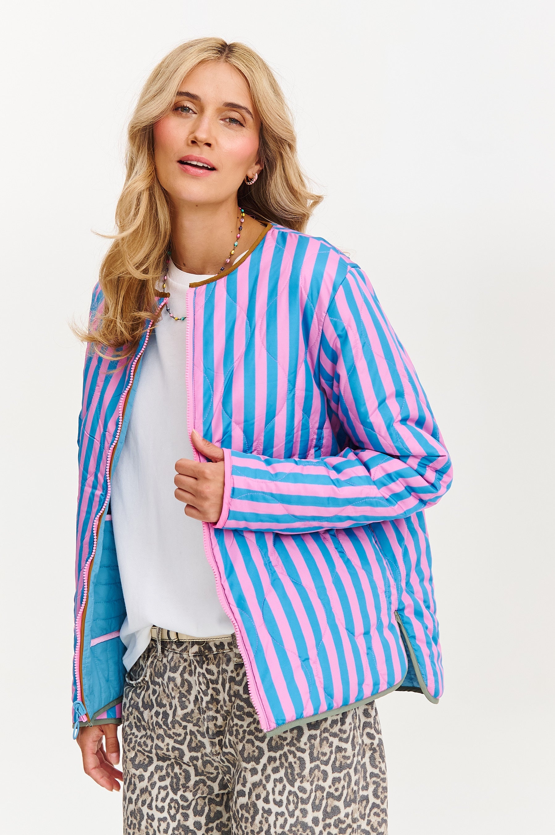 La giacca double-face Poppy Cloudline combina delicate sfumature di blu con accenti giocosi e a contrasto. Da un lato presenta un aspetto liscio effetto denim con tasche, dall’altro un motivo geometrico nei toni del rosa e del blu. Questa giacca ti offre scelta e completa libertà – qualunque lato tu scelga. Si abbina bene sia con le sneakers che con gli stivali.