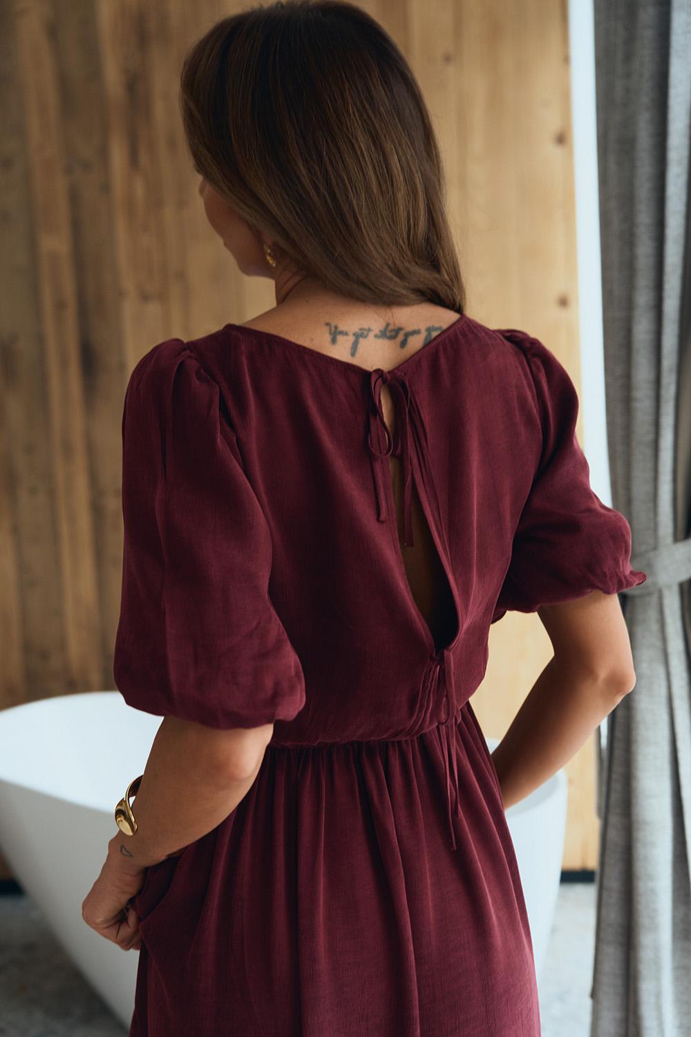 Abito midi Ruby Rose attira l'attenzione con la sua tonalità intensa di rosso profondo. Il corpetto aderente e la gonna leggermente svasata bilanciano perfettamente le proporzioni della silhouette. Le maniche a sbuffo e un sorprendente taglio sulla schiena, che rivela delicatamente la pelle, aggiungono fascino.