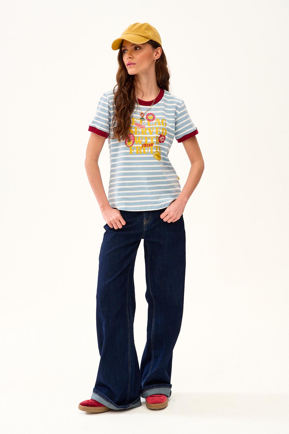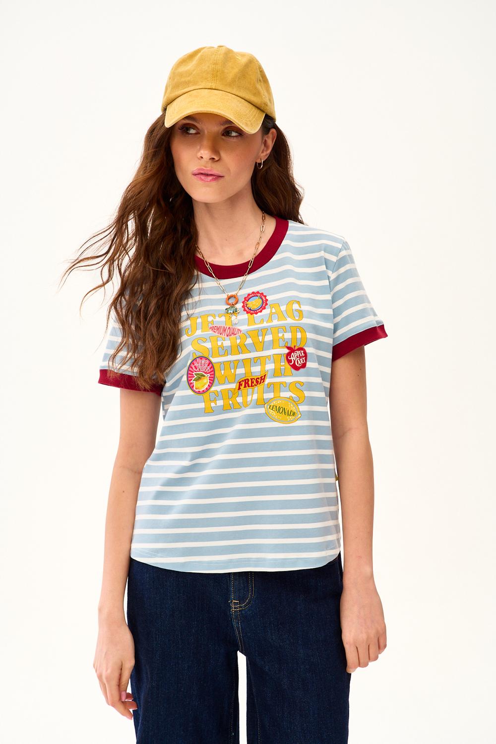La T-shirt Jet Lag è una vera bomba di vitamine nel tuo guardaroba. Le righe blu contrastano con i polsini rossi, creando un look dinamico e sportivo. La grafica centrale con frutta e la scritta "Jet Lag servita con frutta fresca" ti ricorda la freschezza e la spensieratezza dell’estate.