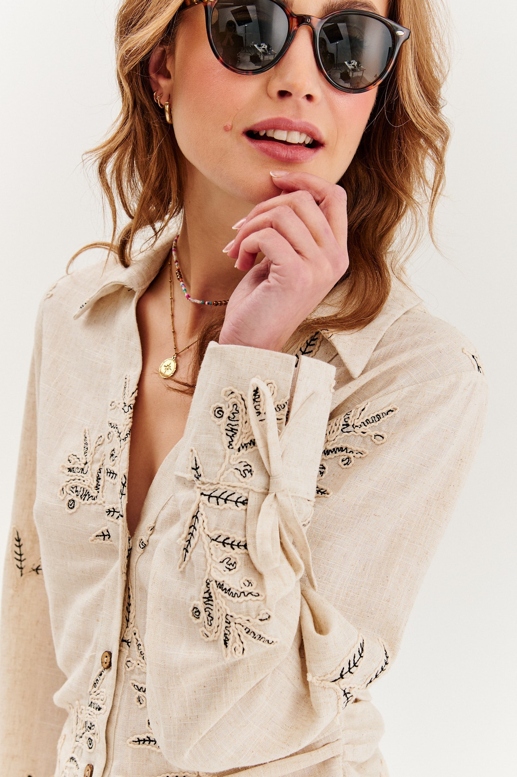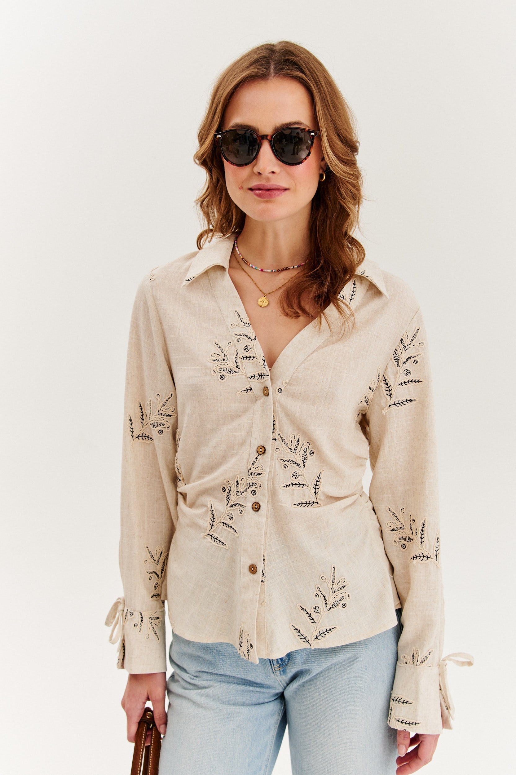 La camicia in lino Timeless Leaves è un'opzione leggera e ariosa per la stagione calda che combina una tonalità naturale cipria con stampe floreali decorative. Il taglio aderente, il colletto classico e le decorazioni sottili le conferiscono un carattere unico nello spirito boho e della spensieratezza estiva.