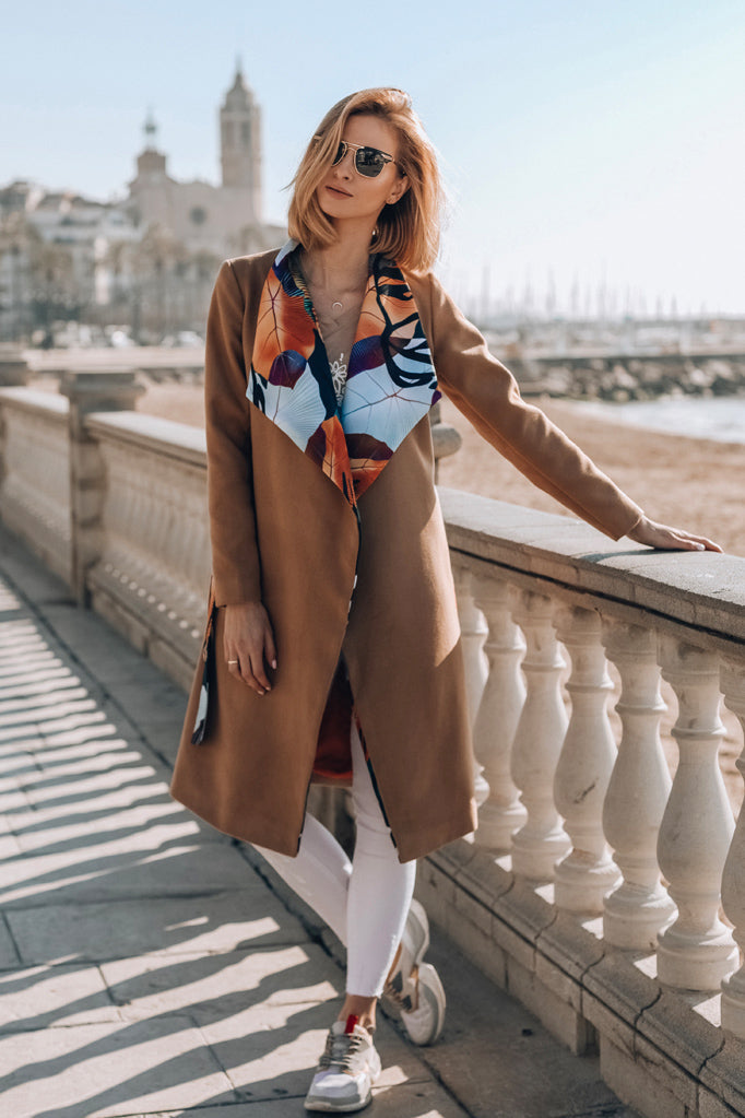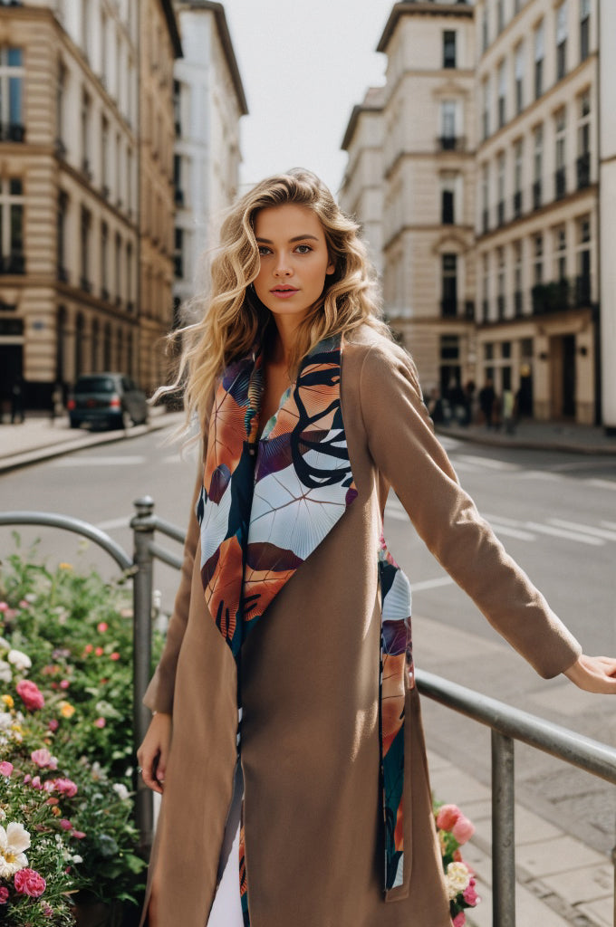 Il cappotto beige Tropical Rain ha revers del colletto con motivo e una cintura annodata in vita con un motivo simile. Foglie arancioni, viola e bianche illuminano il viso e donano un tocco di freschezza allo styling.