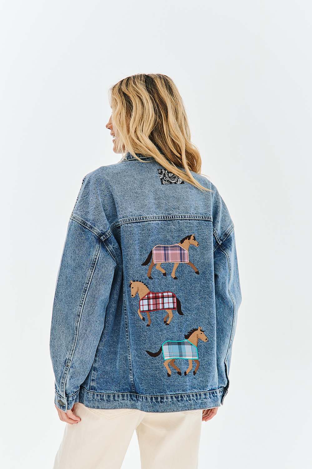 The Western Whisper denim jacket is a tribute to freedom and a rural atmosphere. The light shade of denim provides the perfect backdrop for intricately crafted embroidery depicting horses in colorful blankets and stars. This garment tells a story and attracts attention with its original details.