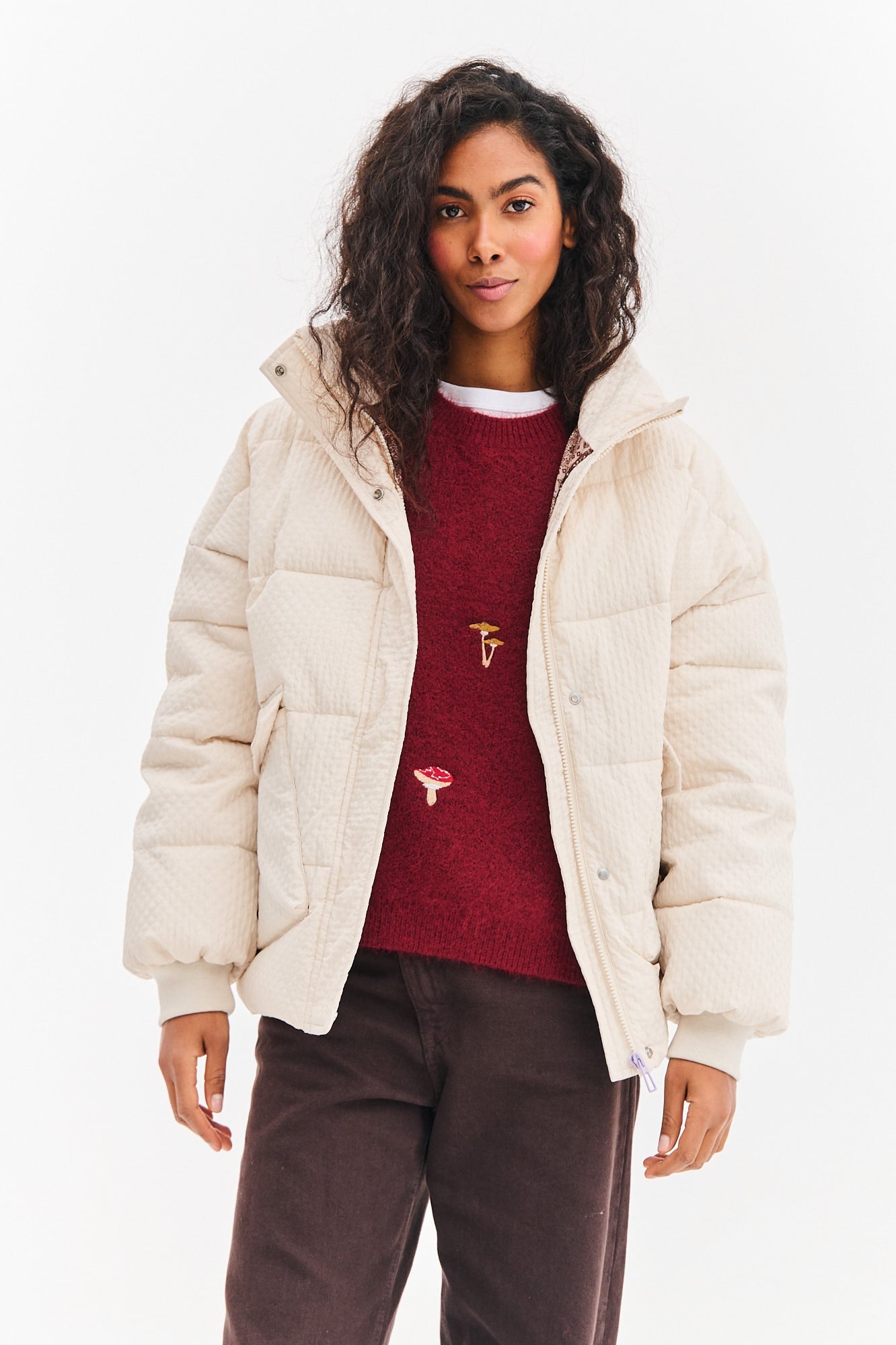 Denali Nomada winter jacket is the quintessential retro ethno style. Its cream color and three-dimensional waffle structure of the material give it a unique character. The paisley pattern, hidden on the inside of the collar, is a detail that delights and emphasizes its uniqueness.