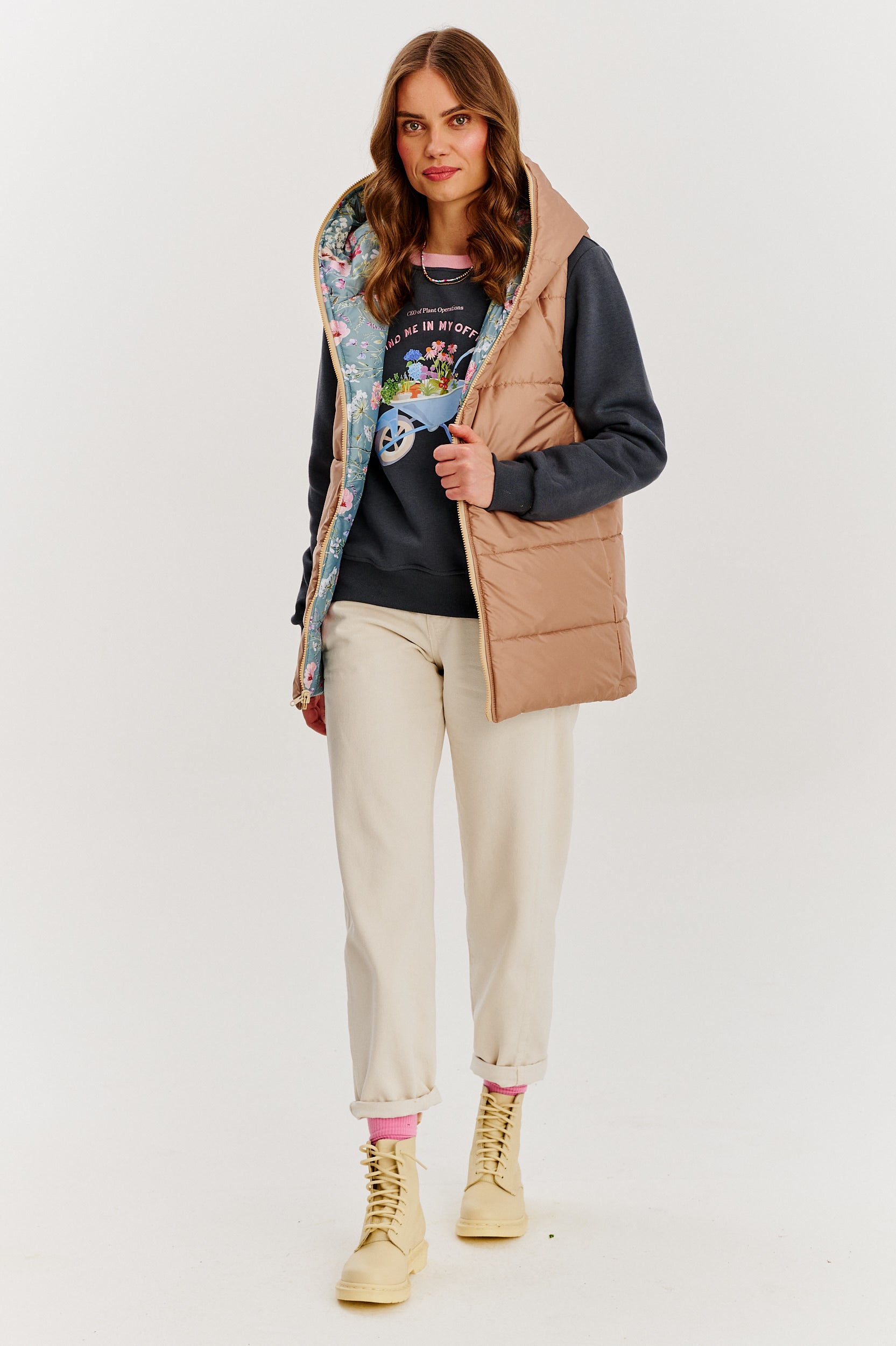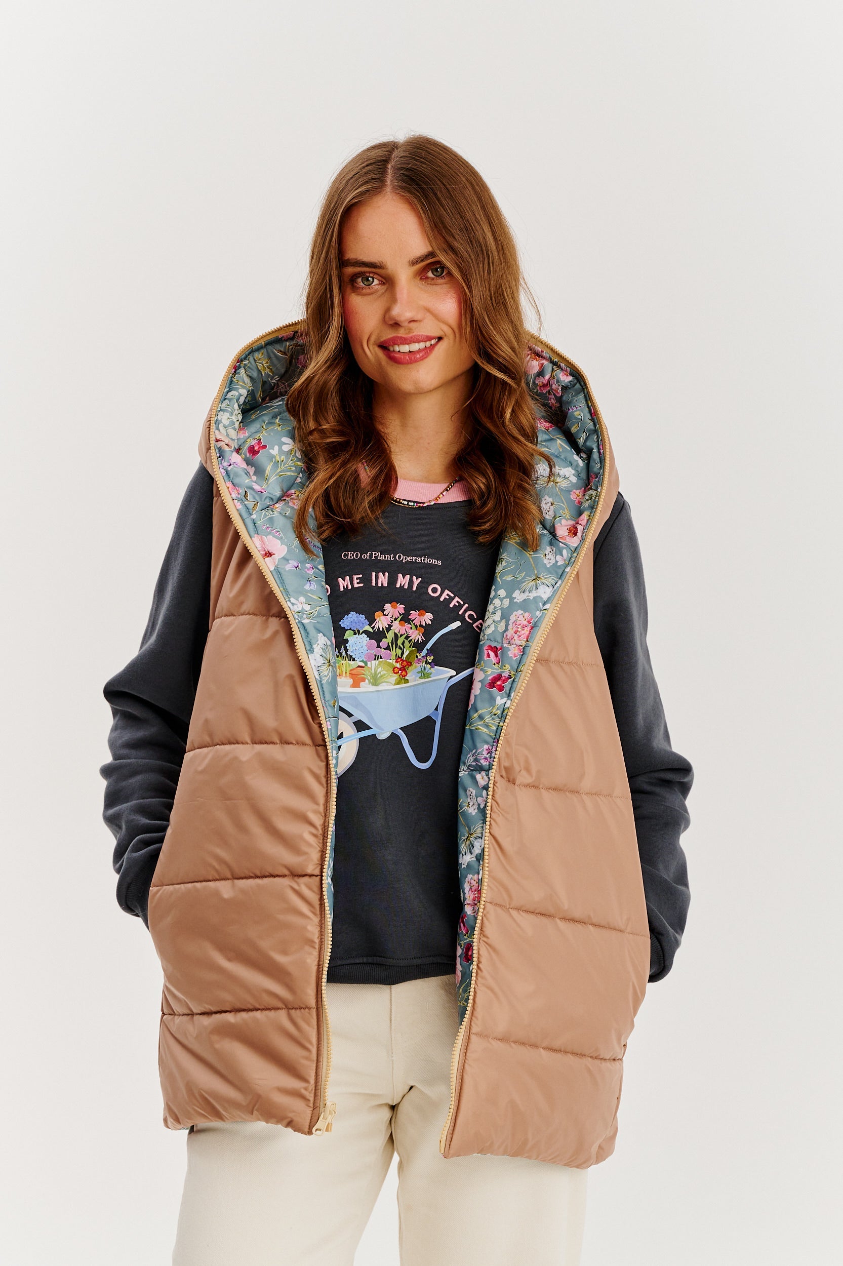 Aan de ene kant - munt en bloemen, aan de andere kant - klassieke karamel. Fresh Focus dubbelzijdig vest is een voorstel voor wie van comfort houdt, maar niet wil inleveren op het “wow”-effect in styling. Het is de perfecte metgezel voor lentewandelingen, weekenduitstapjes of dagelijkse stedelijke avonturen.