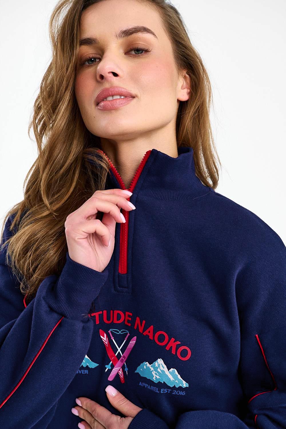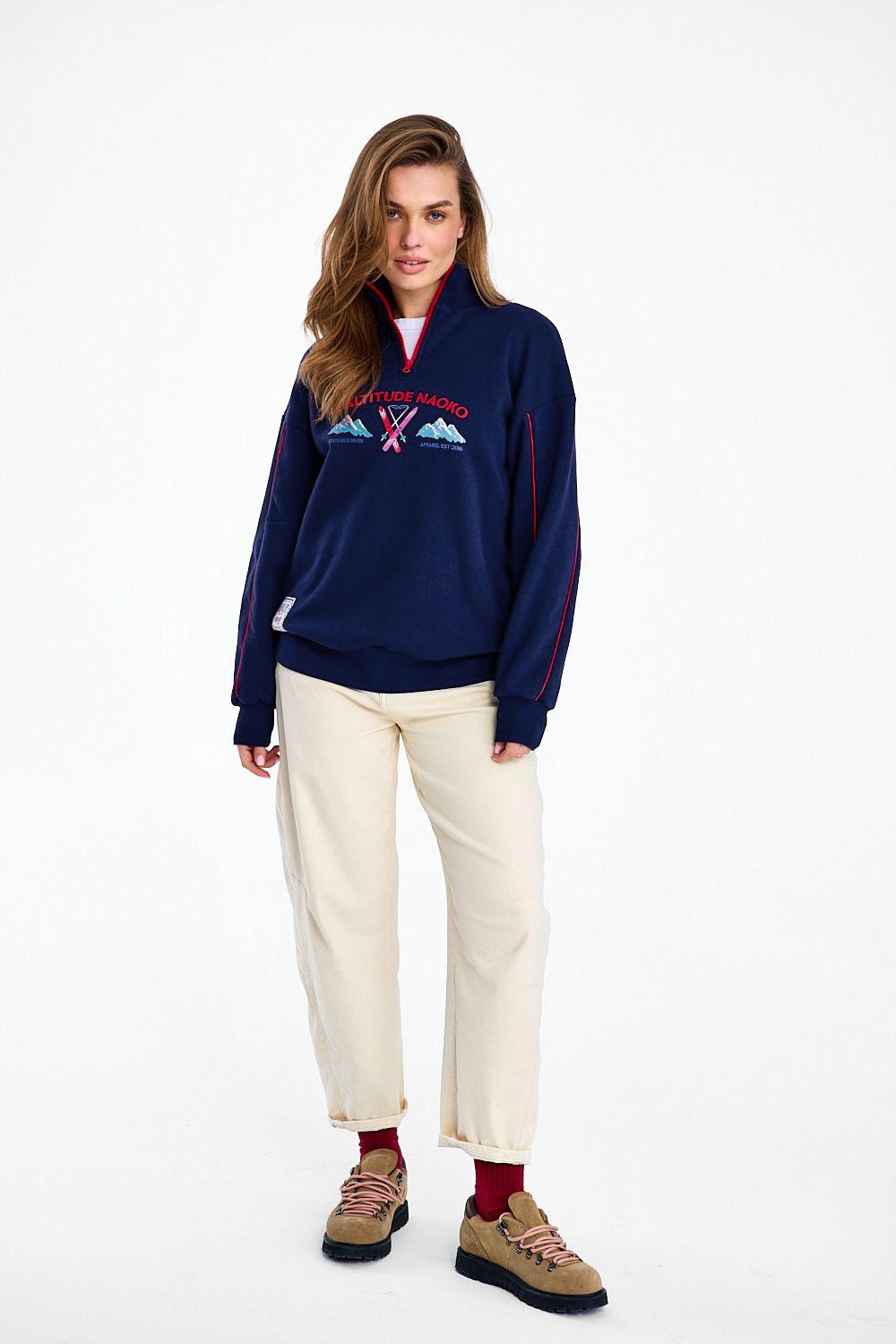 High Altitude sweatshirt is een eerbetoon aan de après-ski cultuur. Het diepe marineblauw contrasteert met de energieke rode biezen en rits, wat het een dynamisch karakter geeft. Het ski-logo staat op de borst, maar de achterkant maakt de grootste indruk – een grote, kleurrijke illustratie van een skipiste, kabelbaan en skiërs.